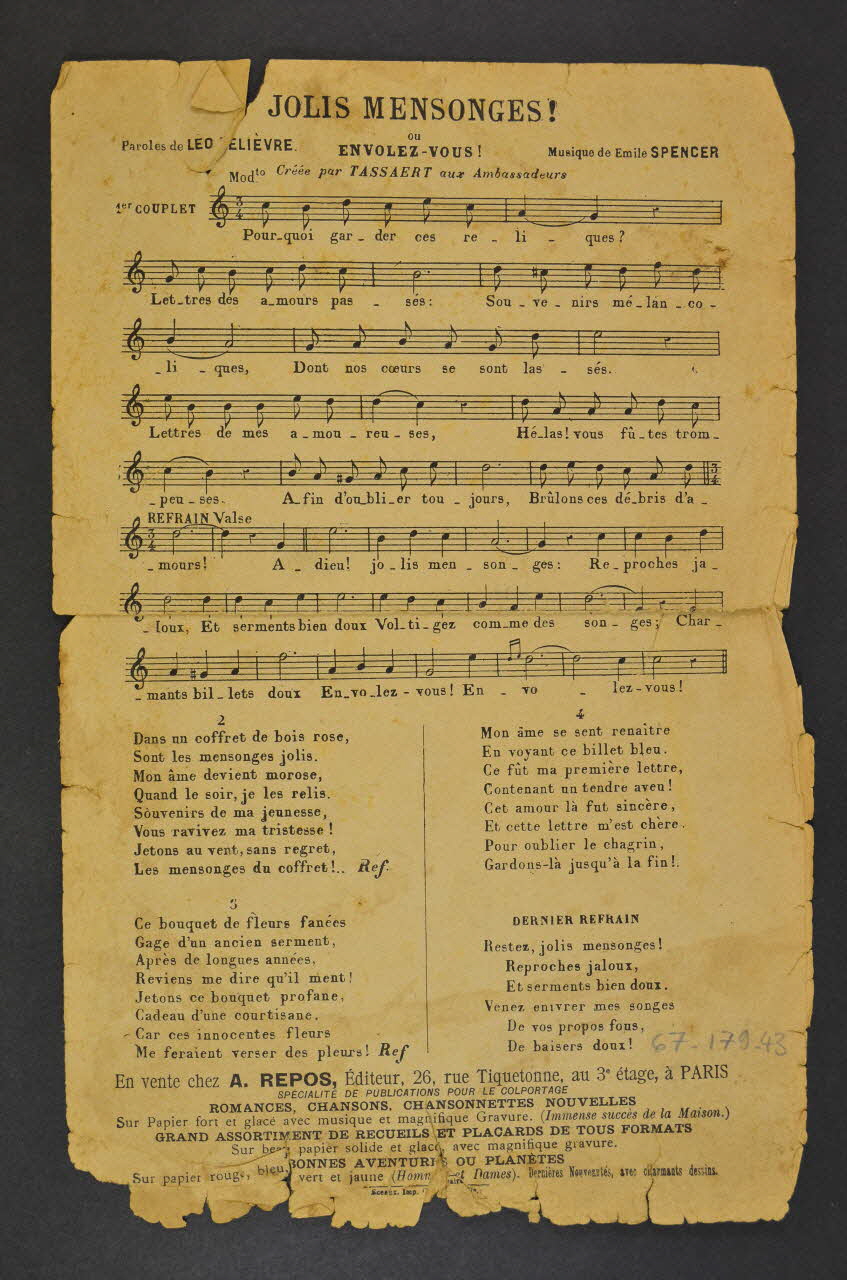 chanson, partition de musique, petit format, Jolis mensonges !