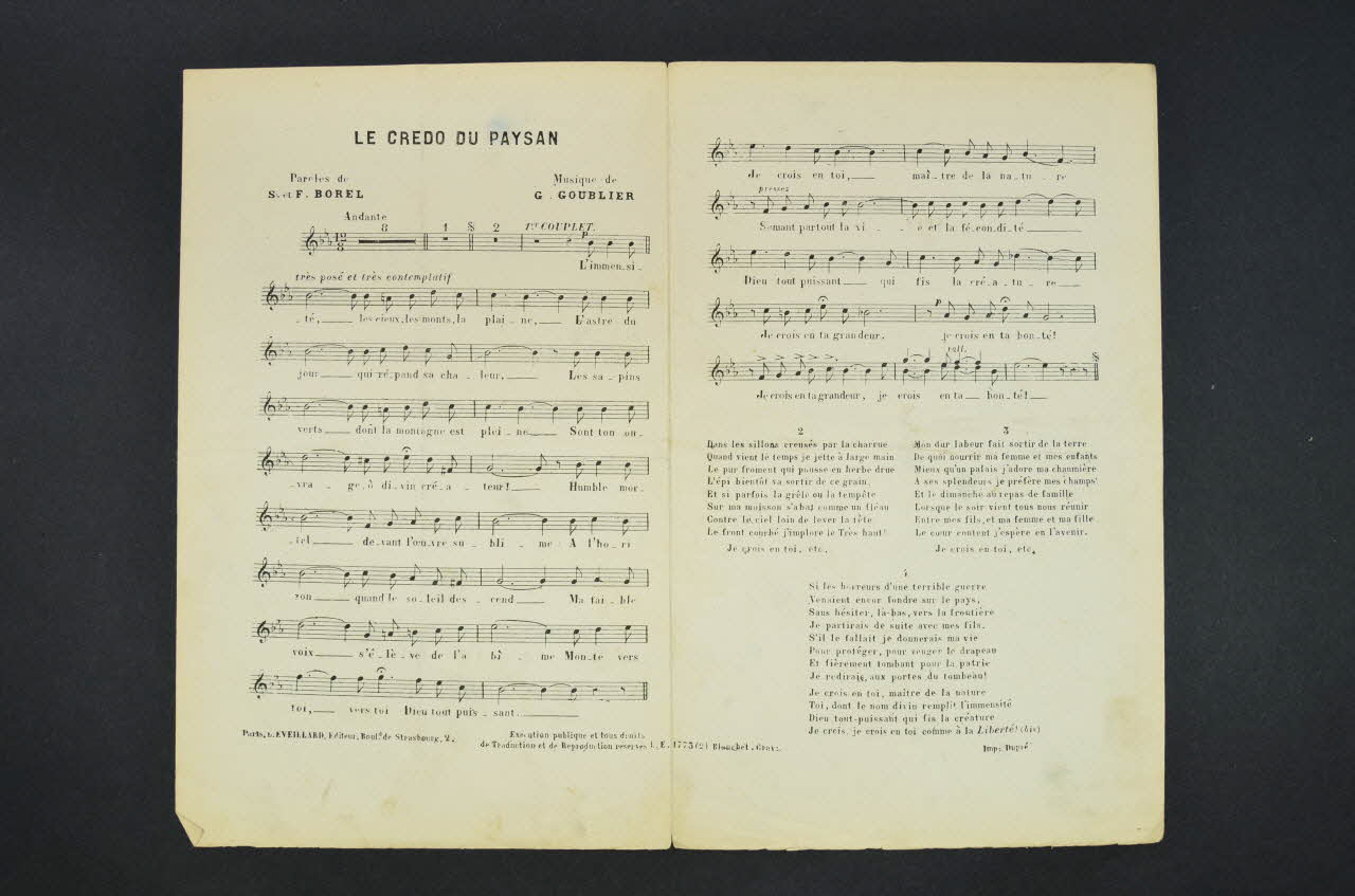 Feuillet rectangulaire en papier industriel imprimé à l'encre noire. Sur la couverture, le dessin d'un paysan priant dans un champ.
