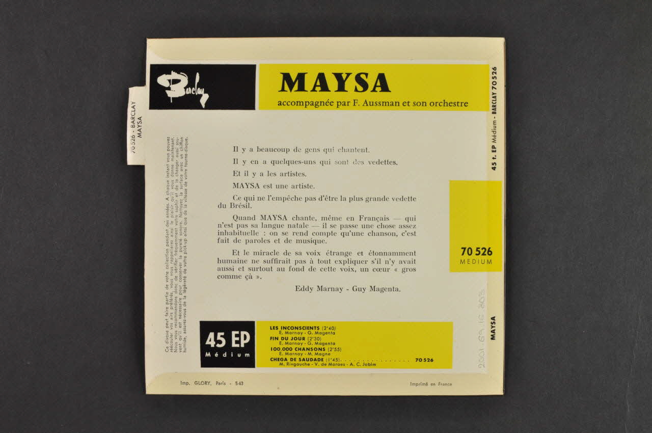 Le recto comporte le titre des chansons et le nom de l'artiste en haut. En-dessous, une photographie noir et blanc représente la chanteurse pensive, une cigarette à la main. Le logo de l'éditeur se trouve dans le coin inférieur droit. Le verso contient le nom du groupe, le titre des chansons et d'autres inscriptions. Un onglet blanc contenant une inscription en noir se trouve le long de la bordure gauche.Matériaux et techniques
