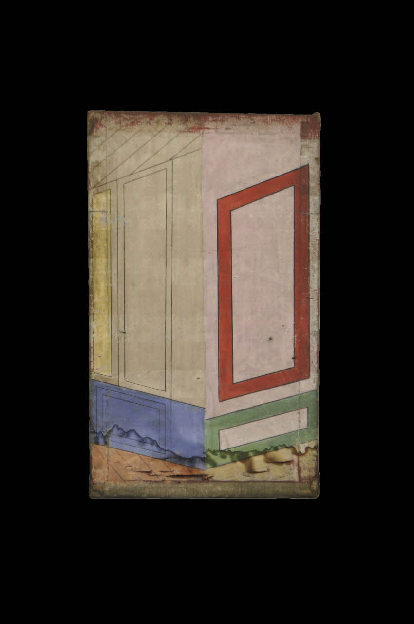 Le décor peint se retrouve sur les deux faces. La première montre un intérieur d'appartement avec des lambris de couleurs rouge, vert et bleu. La seconde présente également un décor d'intérieur d'appartement avec un élément peint en bleu foncé. La partie inférieure comporte deux coins en fer aux angles.Matériaux et techniques