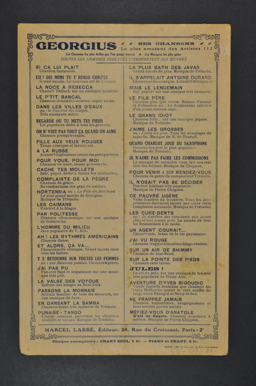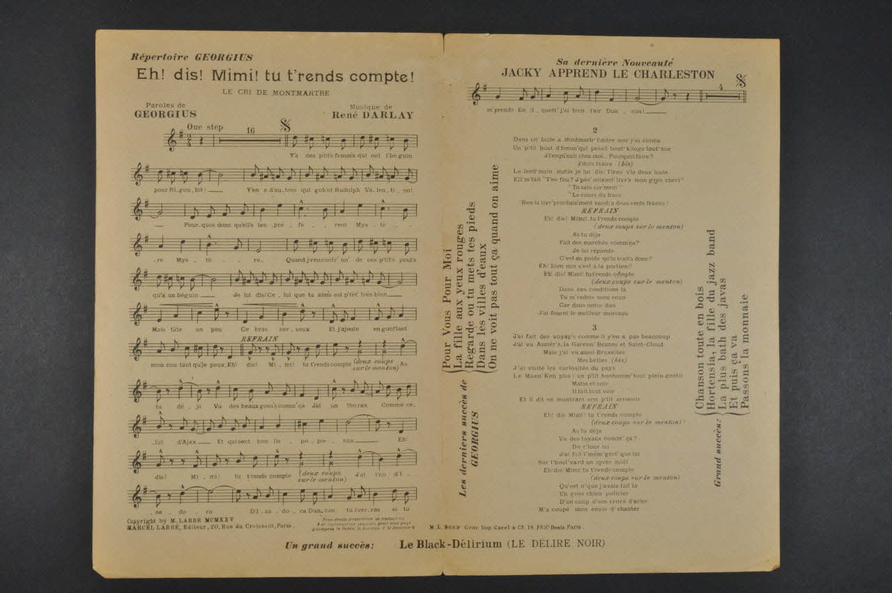 Des inscriptions renseignent le titre, les auteurs, les exécutants et l'éditeur. A l'intérieur, partition et paroles de la chanson. Au dos, liste d'autres partitions publiées par l'éditeur.Décor