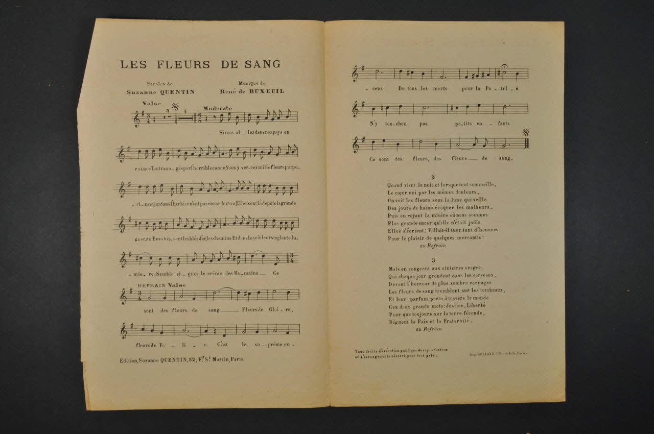 Feuillet rectangulaire en papier industriel imprimé à l'encre. A l'intérieur, partitions et paroles de la chanson. Au dos, publicité pour l'éditeur.