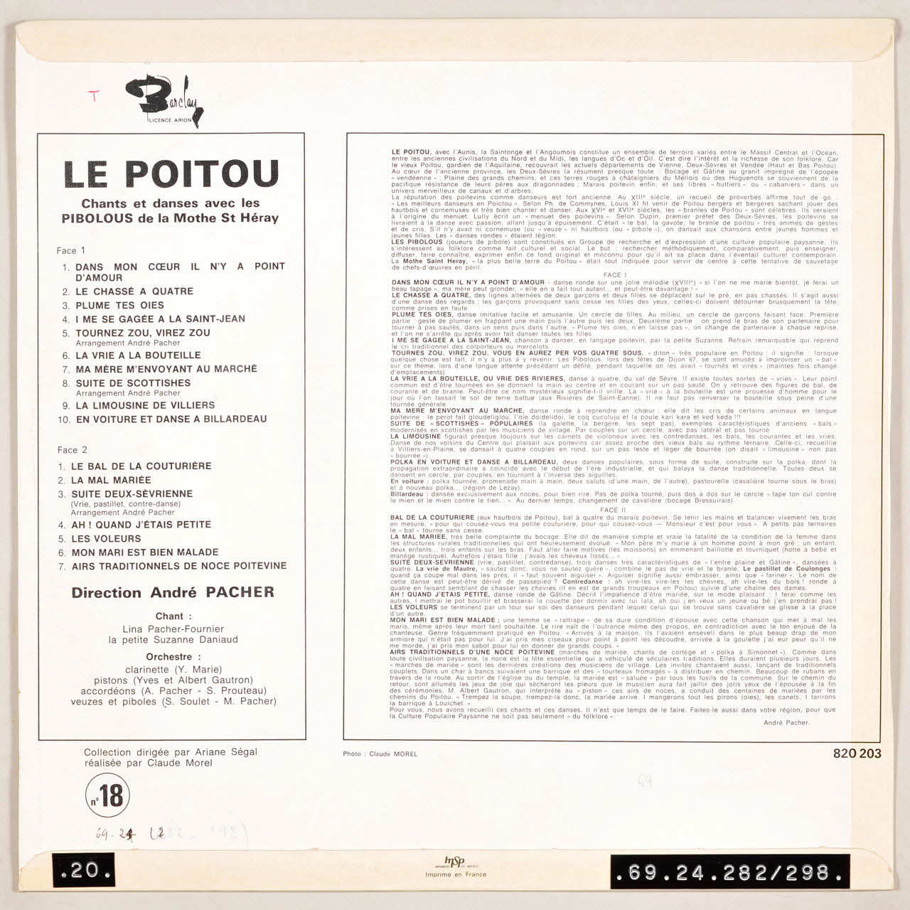 Des inscriptions sur les deux faces de la pochette et sur l'étiquette orange et blanche du disque renseignent les titres et les exécutants de l'album. Au verso, un texte explicatif détaille chaque chanson.Matériaux et techniques