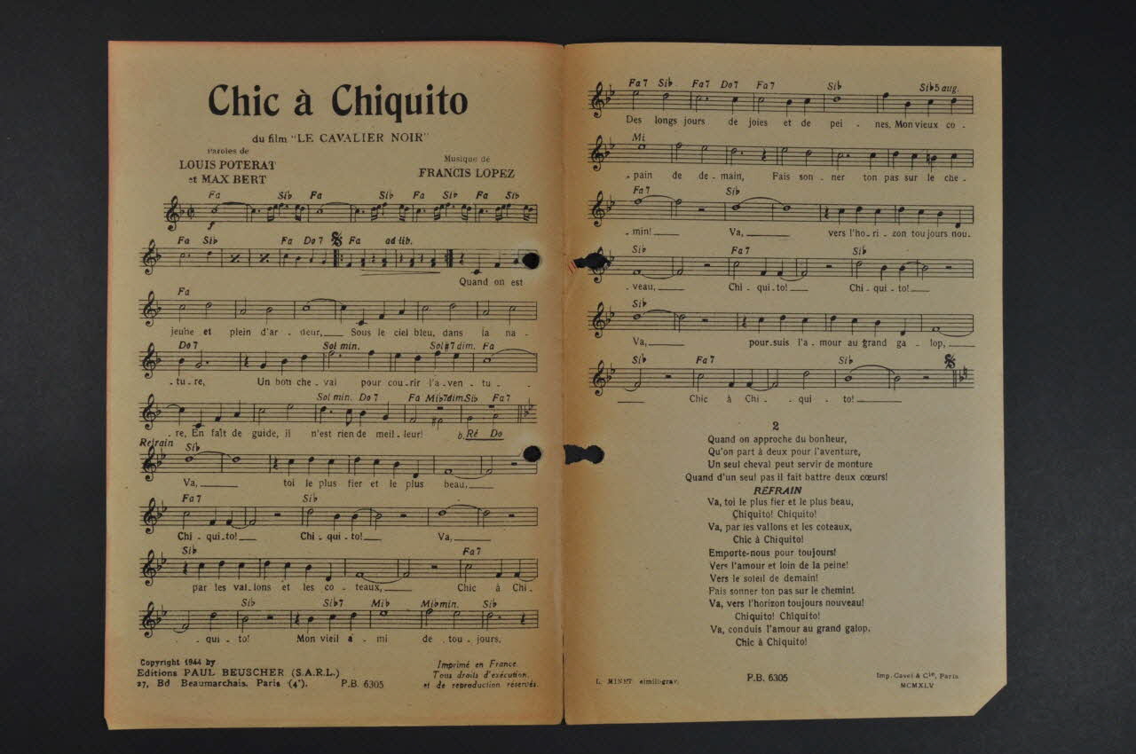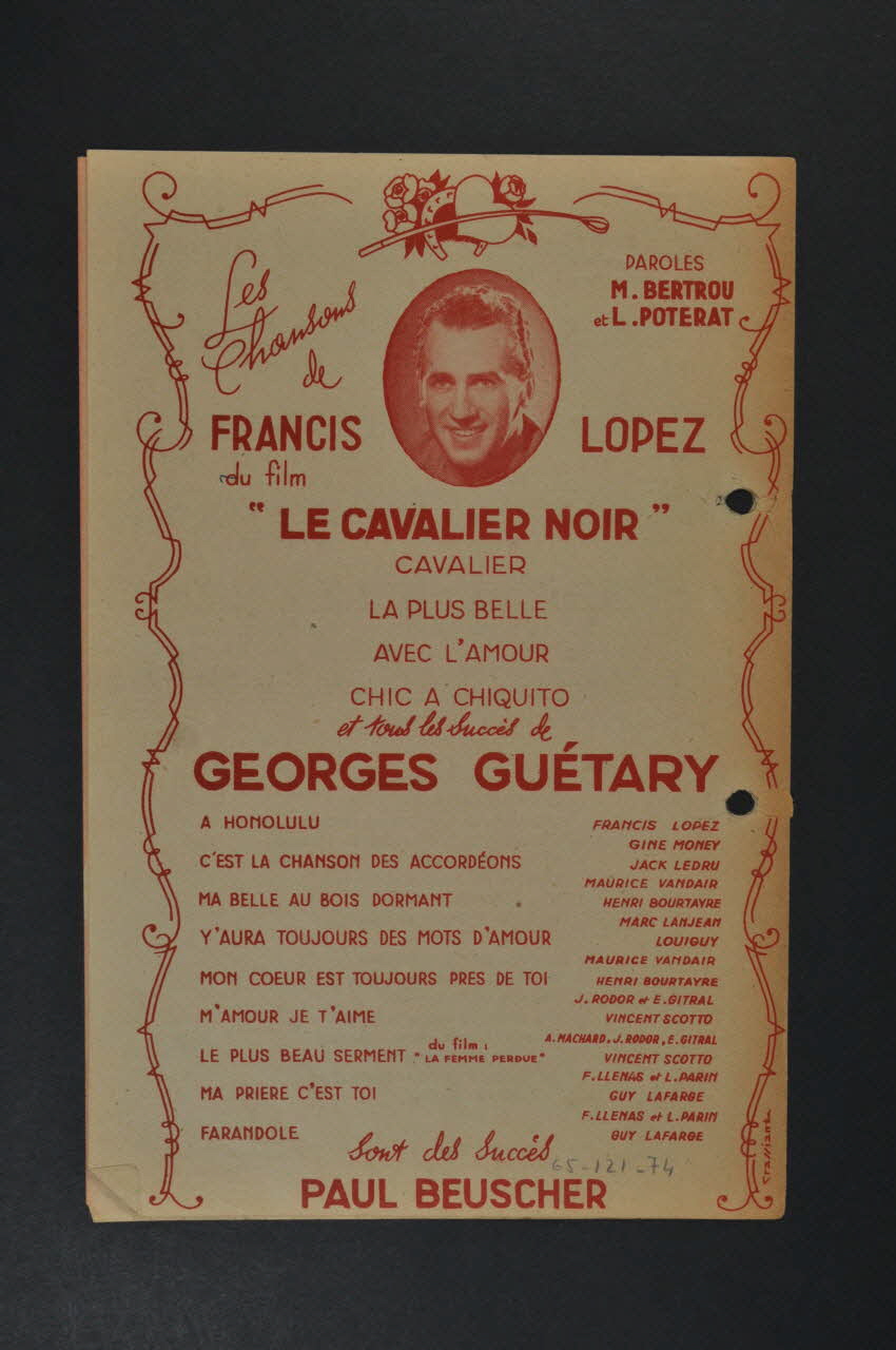 La première page présente la photographie de Georges Guétary. Les inscriptions précisent le titre de la chanson, l'auteur et l'éditeur. A l'intérieur se trouvent la partition et les paroles de la chanson. Au dos se trouve une liste des morceaux disponibles chez le même éditeur. Le feuillet est perforé en deux endroits près de la tranche.Matériaux et techniques
