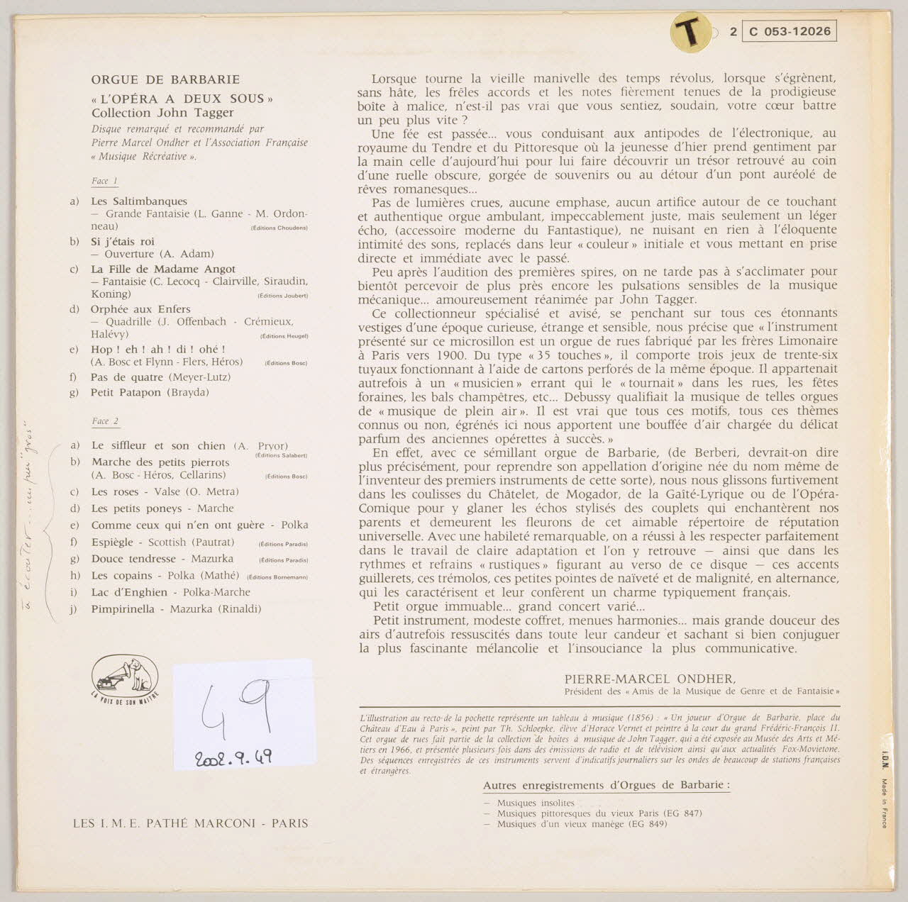 Au recto de la pochette, un dessin représentant un joueur d'orgue de Barbarie devant une fontaine. Sur l'instrument de musique, un singe jouant du tambourin devant un public rassemblé.