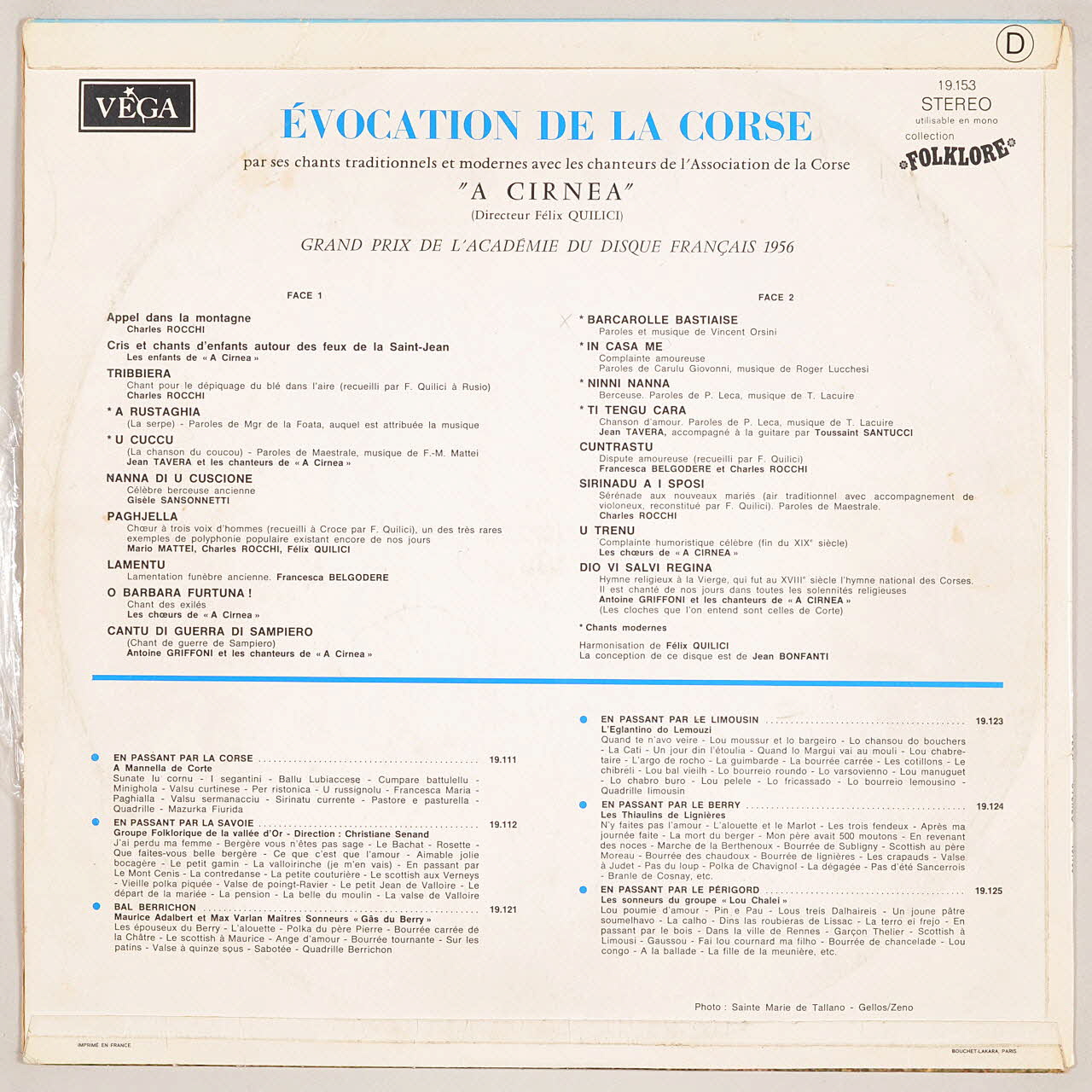 disque 33 tours, O Barbara Fortuna, U cucu, Cuntrastu, Evocation de la Corse, Sirinadu a i sposi, Barcarolle bastiaise, Ti tengu cara, A Rustaghia, Appel dans la montagne, Paghjella, Cantu di guerra di sampiero, Ninni Nanna, In casa me, Dio vi salvi Regina, Nanna di u cuscione, Cris et chants d'enfants autour des feux de la Saint Jean, U trenu, Lamentu, Tribbiera