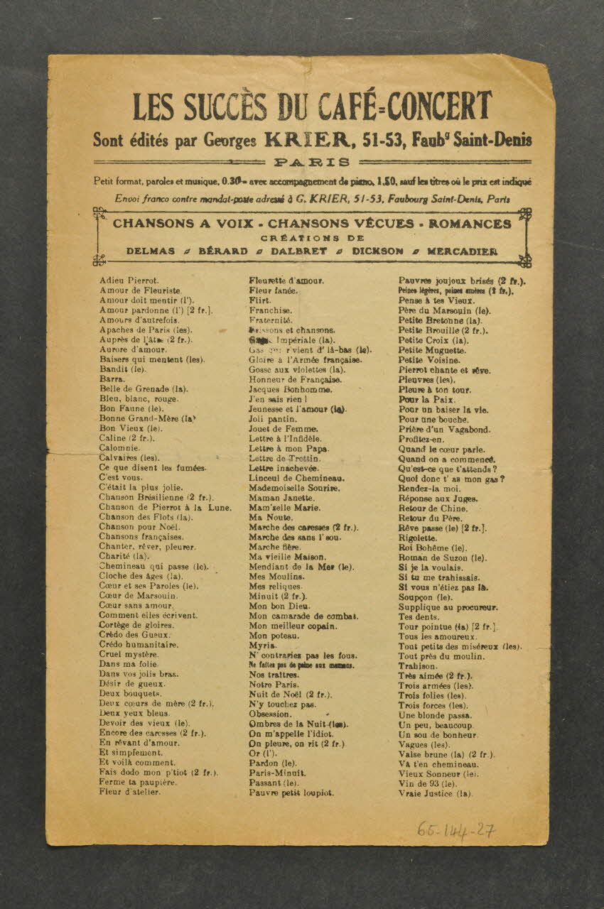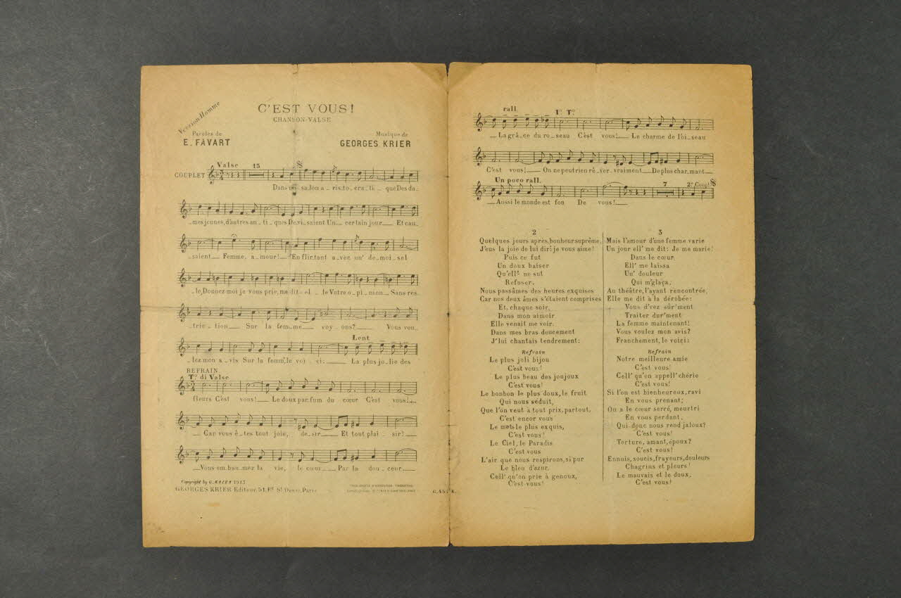 A l'intérieur, partition et paroles de la chanson. Au dos, liste d'autres partitions publiées par l'éditeur.Décor