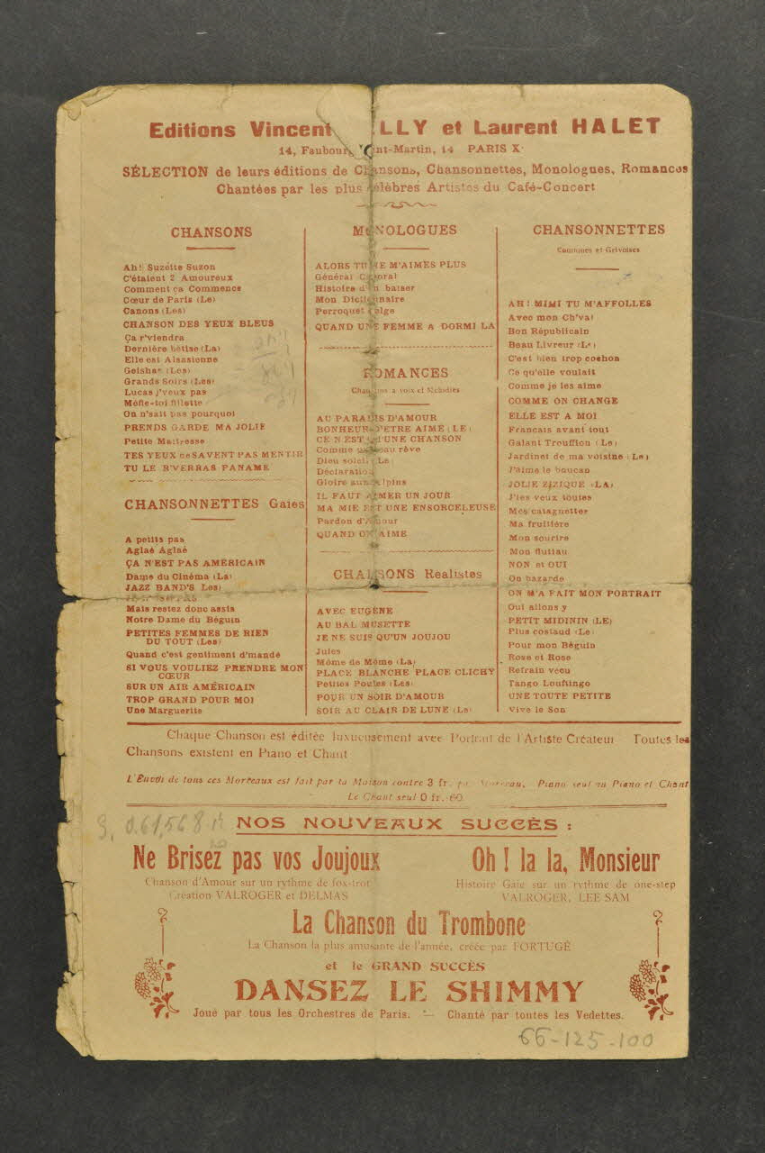 Des inscriptions renseignent le titre, les auteurs, les exécutants et l'éditeur. A l'intérieur, partition et paroles de la chanson. Au dos, liste d'autres partitions publiées par l'éditeur.Décor