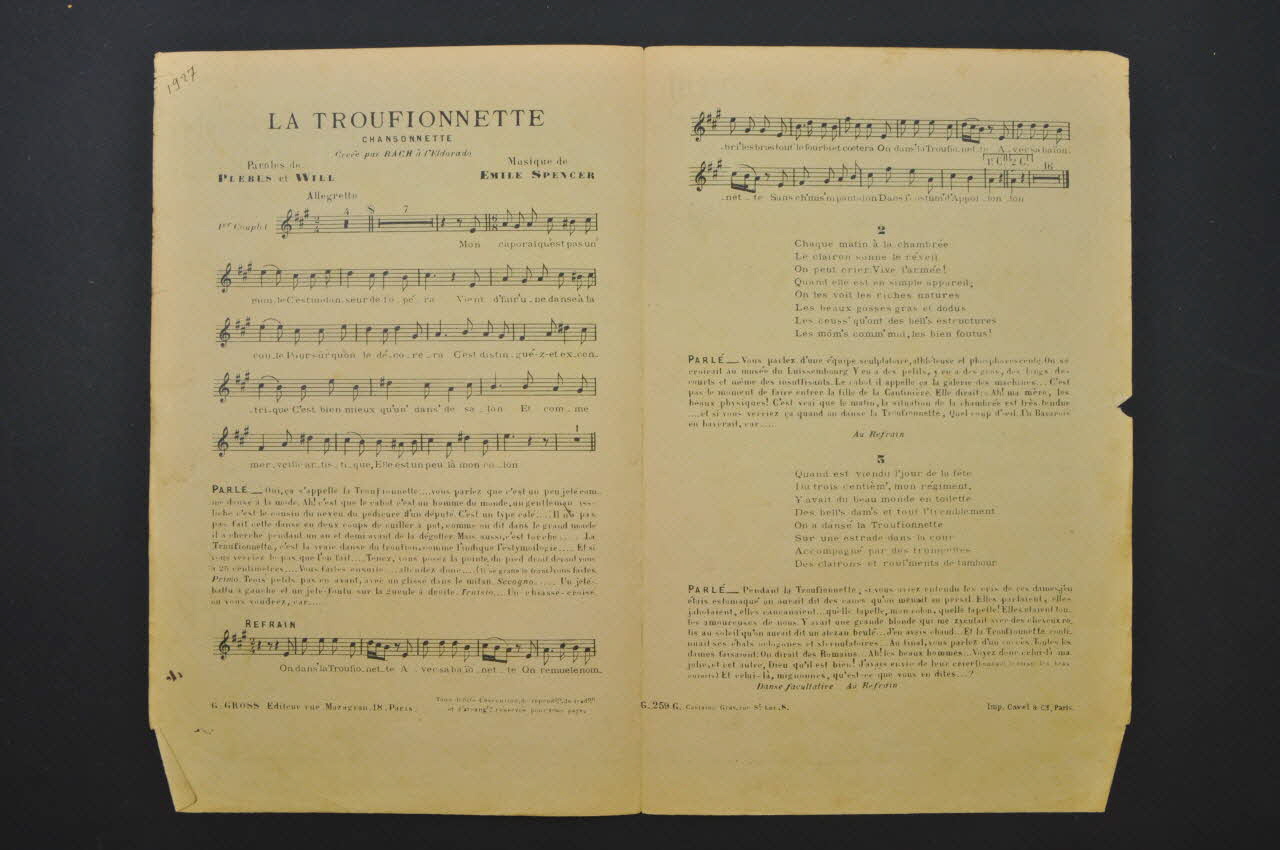 Sur la couverture, la représentation du chansonnier Bach en tenue militaire, riant. Les inscriptions renseignent le titre de la chanson, le nom des auteurs, des artistes et de l'éditeur. A l'intérieur, partition et paroles de la chanson. Au dos, liste d'autres partitions publiées par l'éditeur.Décor