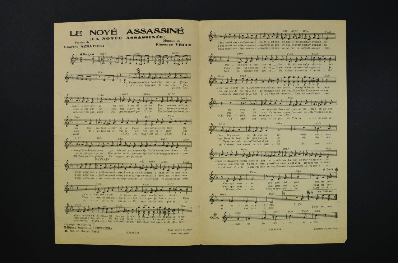 Sur la couverture, le portrait photographique de Philippe Cay, en pieds, bras et jambes croisés ; à gauche, dans un encadrement rectangulaire, portrait photographique de Charles Aznavour. La police de caractère utilisée pour le titre est ondulée et perlée de gouttes de sang. Les inscriptions renseignent le titre de la chanson, le nom des auteurs, de l'artiste et de l'éditeur. A l'intérieur, partition et paroles de la chanson. Au dos, liste d'autres partitions publiées par l'éditeur.Décor