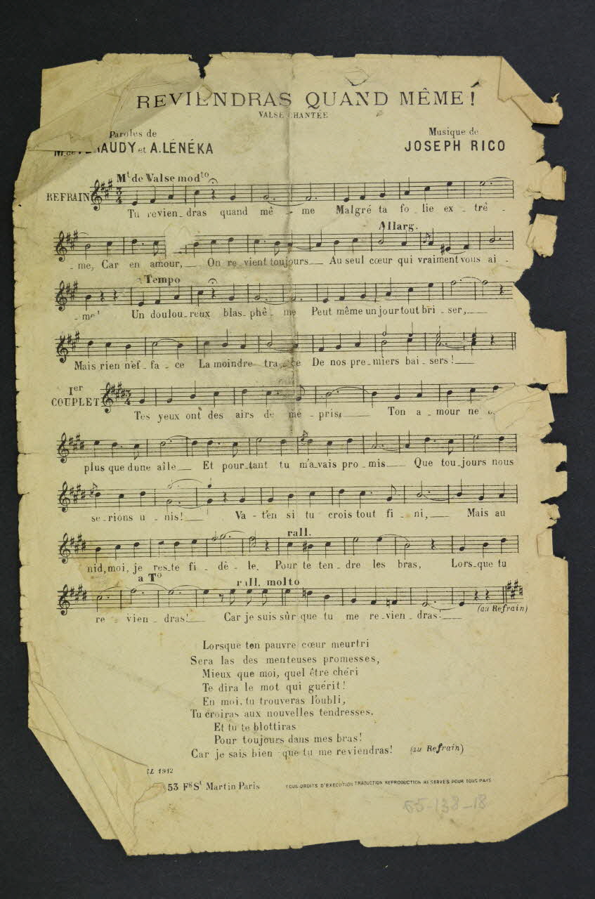 Les inscriptions renseignent le titre de la chanson, le nom des auteurs, de l'artiste et de l'éditeur. L'intérieur est laissé vierge. Au dos, la partition et les paroles.Décor