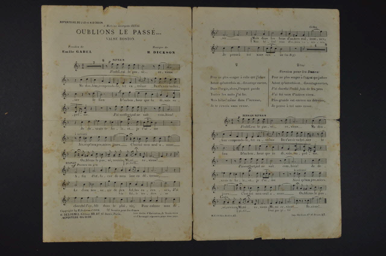 Les inscriptions renseignent le titre de la chanson, le nom des auteurs, de l'artiste et de l'éditeur. A l'intérieur, partitions et paroles de la chanson. Au dos, liste d?autres partitions publiées par l?éditeur.Décor