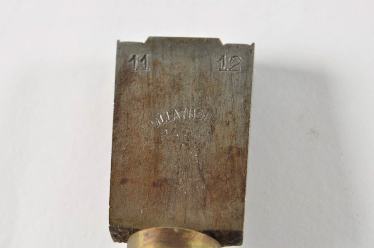 Pièce d'acier épaisse de forme trapézoïdale à deux lissoirs en forme de tétons rectangulaires dans chacun des coins supérieurs, sertie sur un manche de bois tourné. Une petite virole de cuivre sépare les deux éléments. Un petit anneau est placé à l'extrémité inférieure du manche pour l'accrochage. Des inscriptions sont gravées sur l'une des faces de la pièce d'acier.Matériaux et techniques