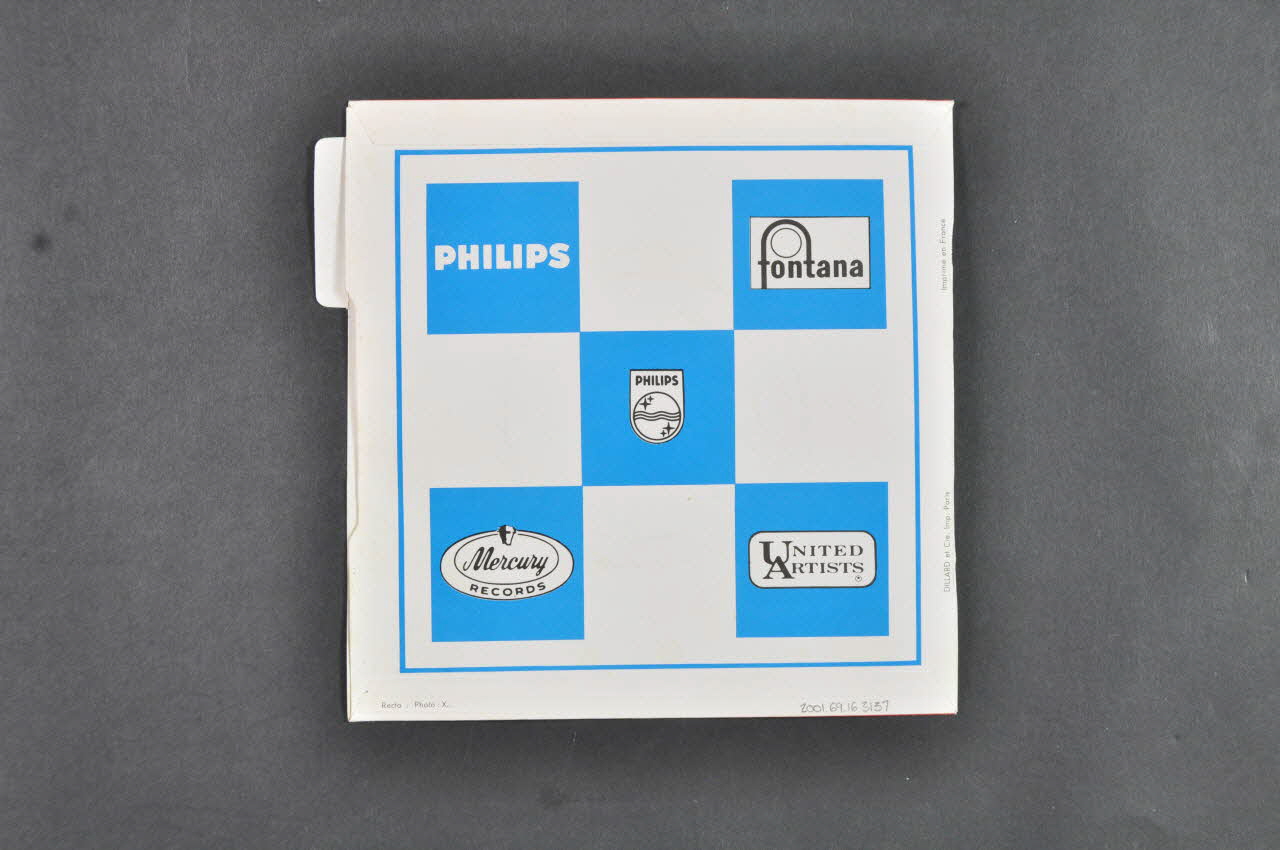 Le recto comporte une photographie noir et blanc du groupe derrière un grillage. Le nom du groupe et les titres des chansons sont inscrits dans la partie supérieure sur un fond rouge. Le logo de l'éditeur est dans l'angle inférieur droit. Un onglet bleu avec des inscriptions noires est situé le long de la bordure droite. Le verso contient un damier bleu et blanc avec des logos de producteurs sur les carrés bleus.Matériaux et techniques