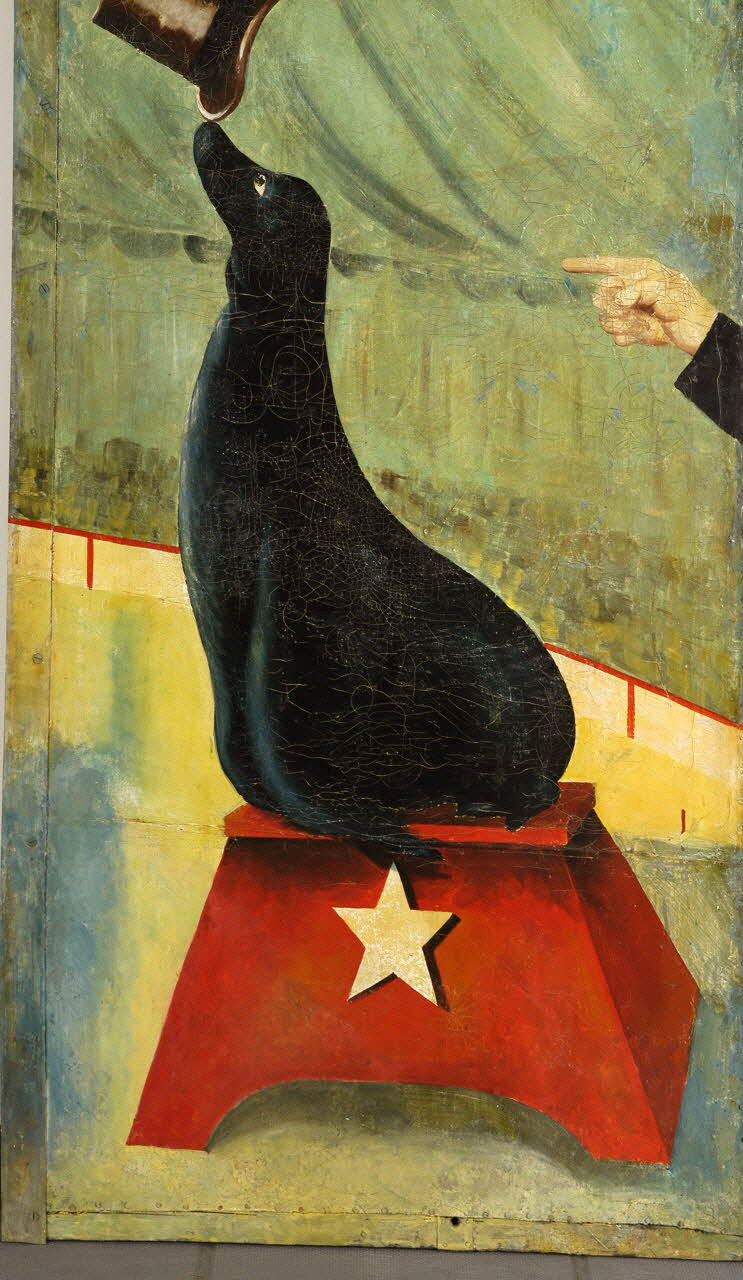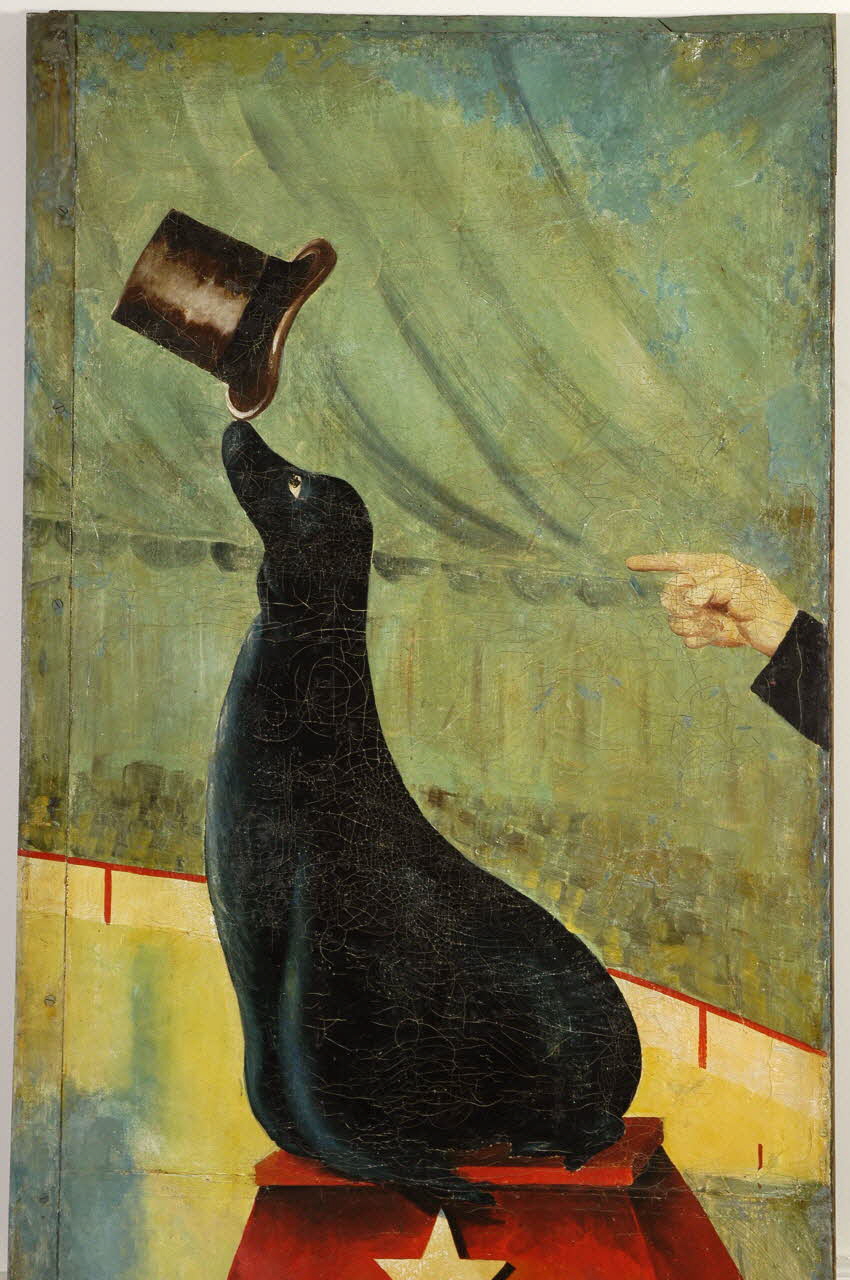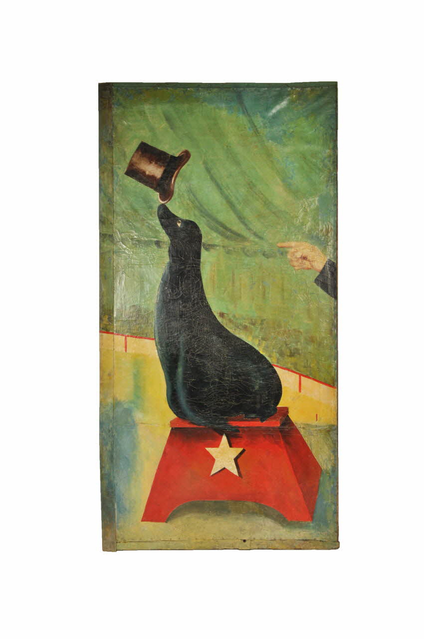 Elle se plaçait entre les toiles 1960.73.10 et 1960.73.12. On note que le bord gauche est contitué d'une plaque de fer sur laquel le décor peint se poursuit. Au revers, dans les angles et au niveau des deux barres transversales, des plaques de tôle triangulaires peintes en rouge sont clouées. Un système d'accrochage à deux crochets noirs est visible en partie supérieure du revers. Le décor peint représente une tente de cirque verte, avec une arène au sol jaune. Une balustrade rouge et blanche sépare l'arène du reste. Au centre, sur un escabeau rouge orné d'une étoile blanche, une otarie noire tient sur le bout de son nez un haut-de-forme marron. Un main la montre du doigt sur la droite, et une manche noire est partiellement visible.Inscriptions