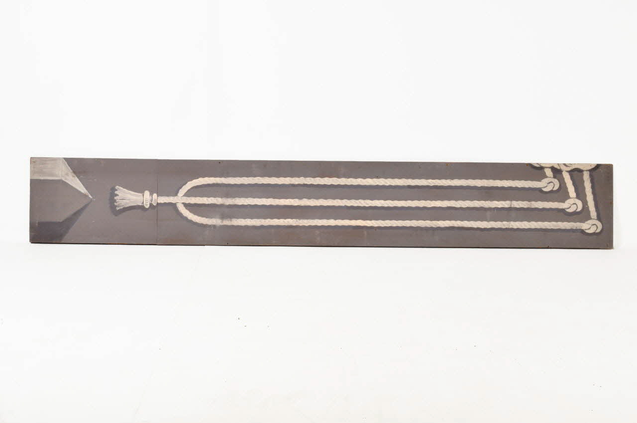 Au dessus, sur toute la hauteur de la planche se développe un décor de cordelières blanches : en partie supérieure, la corde fait trois passages horizontaux, elle retombe sur chaque panneau en une boucle et une extrémité libre terminée par un pompon.