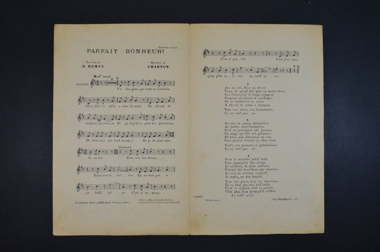 Les inscriptions renseignent le titre de la chanson, le nom des auteurs, de l'artiste et de l'éditeur. A l'intérieur, partition et paroles de la chanson. Le revers est laissé vierge.Matériaux et techniques