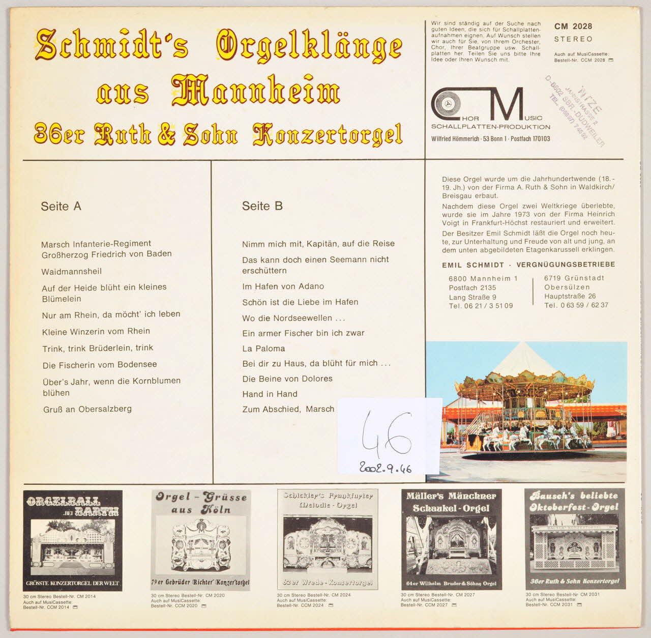 disque 33 tours, Über's Jahr, wenn die Kornblumen blühen, Die Beine von Dolores, Nur am Rhein, da möcht' ich leben, Scmidt's Orgelklänge aus Mannheim, Wo die Nordseewellen trecken an den Strand, Hand in Hand, Ein armer Fischer bin ich zwar, Nimm mich mit, Kapitän, auf die Reise, Schön ist die Liebe im Hafen, Zum Abschied, Blümelein, Marsch Infanterie-regiment, Trink, trinl, Brüederlein, trink, Grub an Obersalzberg, Im Hafen von Adano, Das kann doch einen Seemann nicht erschüttern, Bei dir zu Haus, da blüth für mich, Kleine Winzerin vom Rhein, Grobherzog Friedrich von Baden, Die Fischerin vom Bodensee, La Paloma, Auf der Heide blüht ein kleines