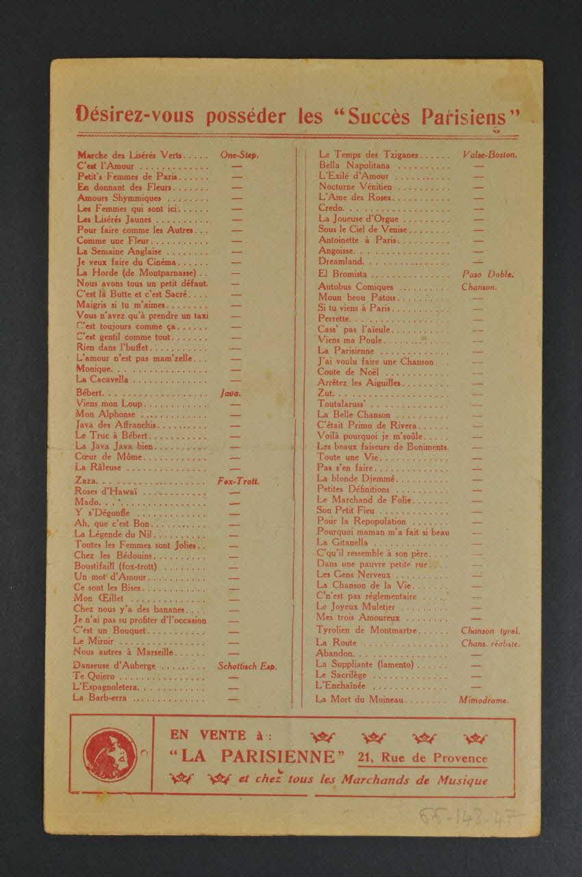 Les inscriptions renseignent le titre de la chanson, le nom des auteurs, de l'artiste et de l'éditeur. A l'intérieur, partitions et paroles de la chanson. Au dos, liste d?autres partitions publiées par l?éditeur.Matériaux et techniques