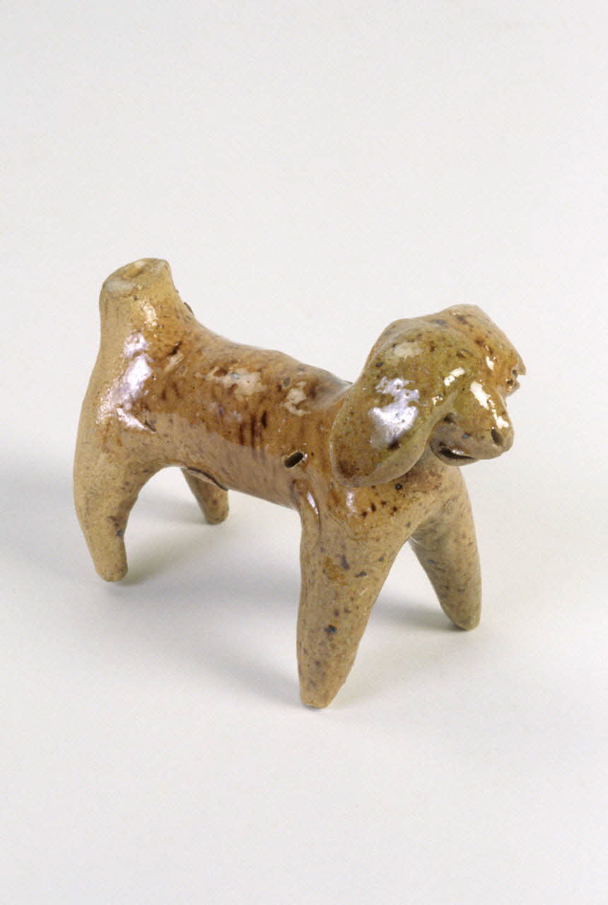 Sifflet en terre cuite vernissée et tachetée de couleur marron-jaune et ocre-brun, représentant un chien (ou une brebis ?) avec deux trous latéraux opposés placés sur le dos. Le système d'insufflation (conduit d'air aménagé) se trouve sur la queue. / Représente un animal (mouton ?) aux grandes oreilles tombantes dont le corps creux forme le résonateur d'une flûte globulaire. L'embouchure se dresse presque verticalement à l'arrière du corps avec le trou d'insufflation percé à l'extrémité supérieure. Une fenêtre rectangulaire étroite est percée à l'arrière du corps. Une petite fente percée à l'avant en haut de chaque flanc sert de trou de jeu. L'objet est modelé assez grossièrement en terre beige. Il est couvert d'une glaçure transparente à mouchetures marron sauf les pattes arrière et l'embouchure, qui restent brutes. Les yeux sont indiqués simplement par un point incisé et les narines et la bouche sont formés également de traits incisés.Décor