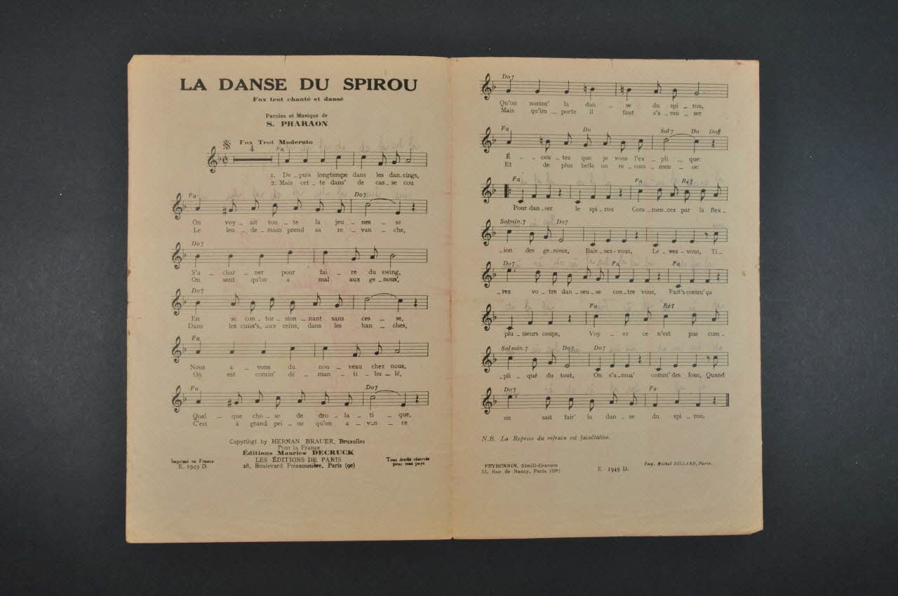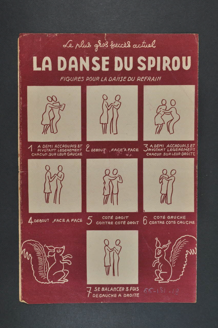 Feuillet rectangulaire en papier industriel, imprimé à l?encre bordeaux (sauf l?intérieur à l?encre noire). La couverture du feuillet présente un dessin d'un écureuil et de couples dansant. Au dos, le descriptif de la danse.