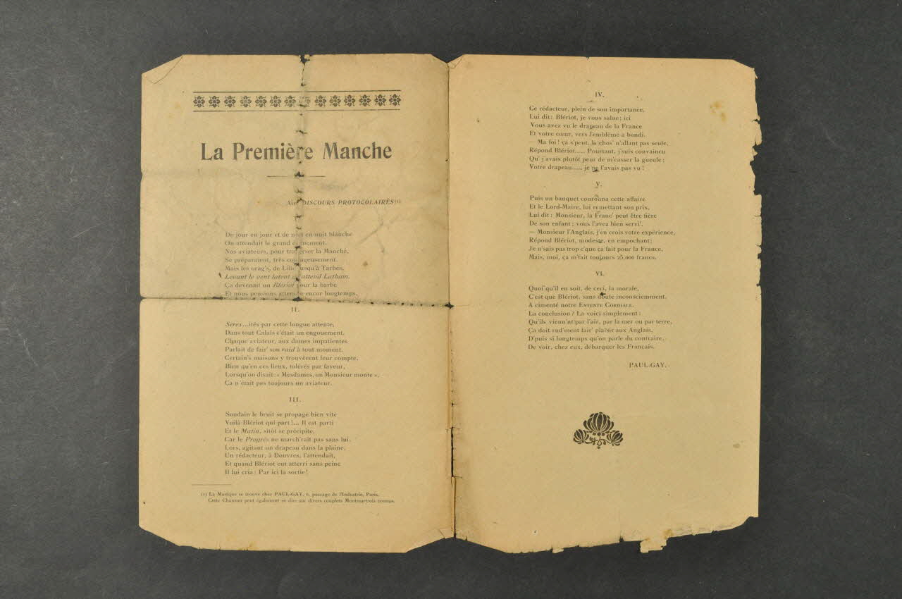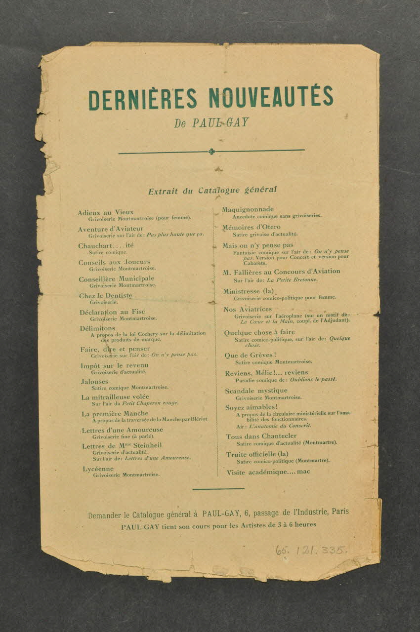 Des inscriptions renseignent le titre, les auteurs, les exécutants et l'éditeur. A l'intérieur, partition et paroles de la chanson. Au dos, liste d'autres partitions publiées par l'éditeur.Matériaux et techniques