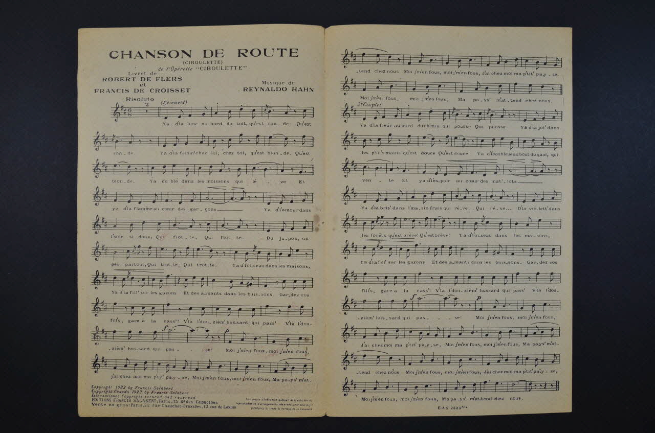 Les inscriptions renseignent le titre de la chanson, le nom des auteurs, de l'artiste et de l'éditeur. A l'intérieur, partitions et paroles de la chanson. Au dos, liste d?autres partitions publiées par l?éditeur.Décor