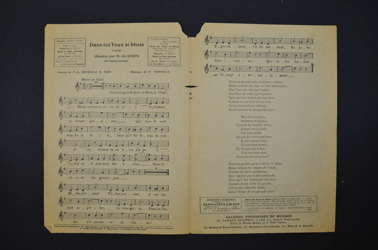 Feuillet rectangulaire en papier industriel imprimé. Le feuillet contient la partition et les paroles de la chanson. Au dos, publicité pour l'éditeur.Matériaux et techniques