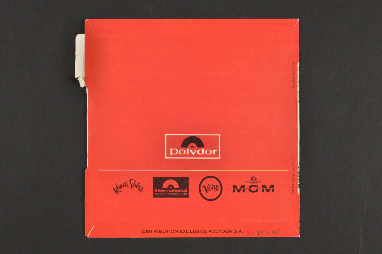 Il s'agit d'une pochette carrée, en papier, imprimée en couleur, pliée et collée. Les inscriptions sont en anglais. En haut à droite se trouve une étiquette rectangulaire, saillante.