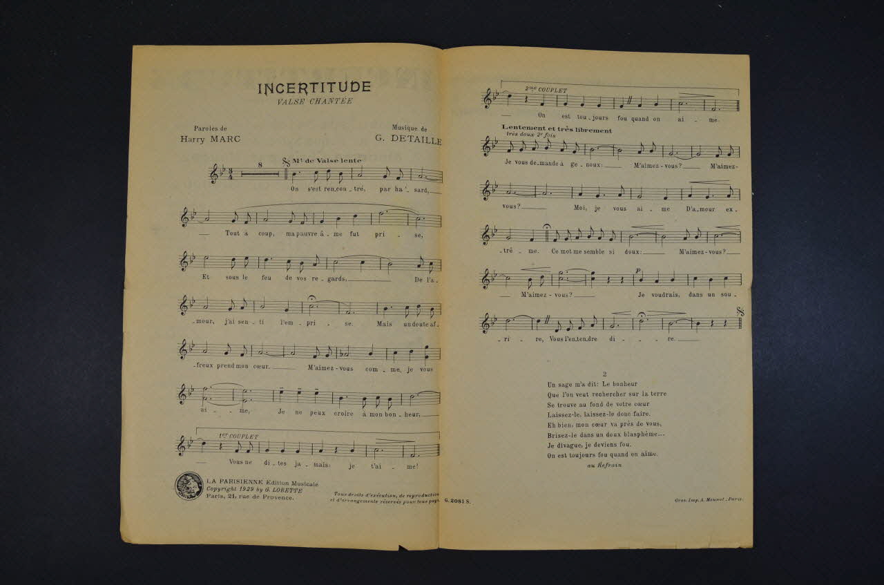chanson, partition de musique, petit format, Incertitude