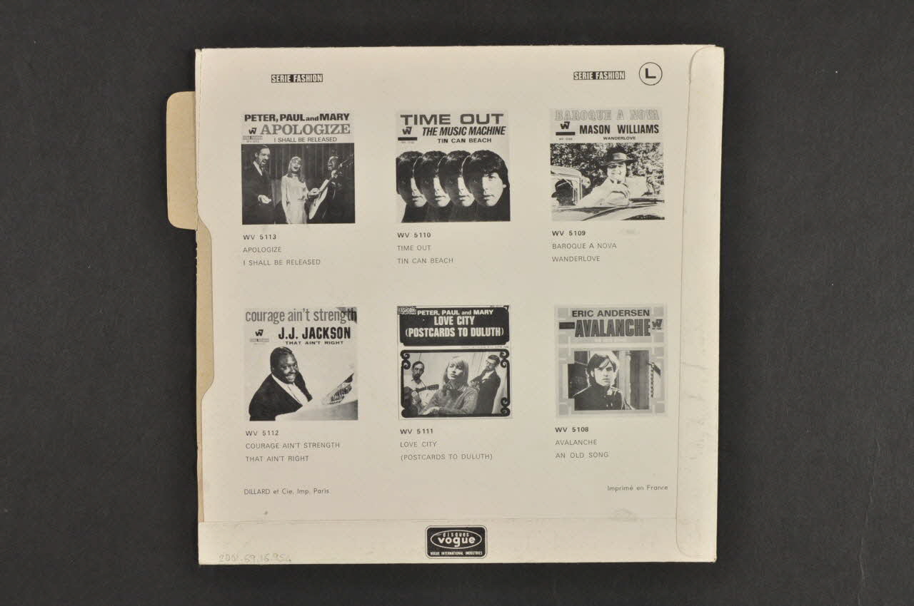 Au recto, une photographie en noir et blanc représente le groupe. Y figurent le titre des deux chansons, le nom du groupe et le logo de l'éditeur. Au verso, sur un fond blanc, sont reproduites six pochettes de disques de la même série accompagnées d'inscriptions noires.Matériaux et techniques