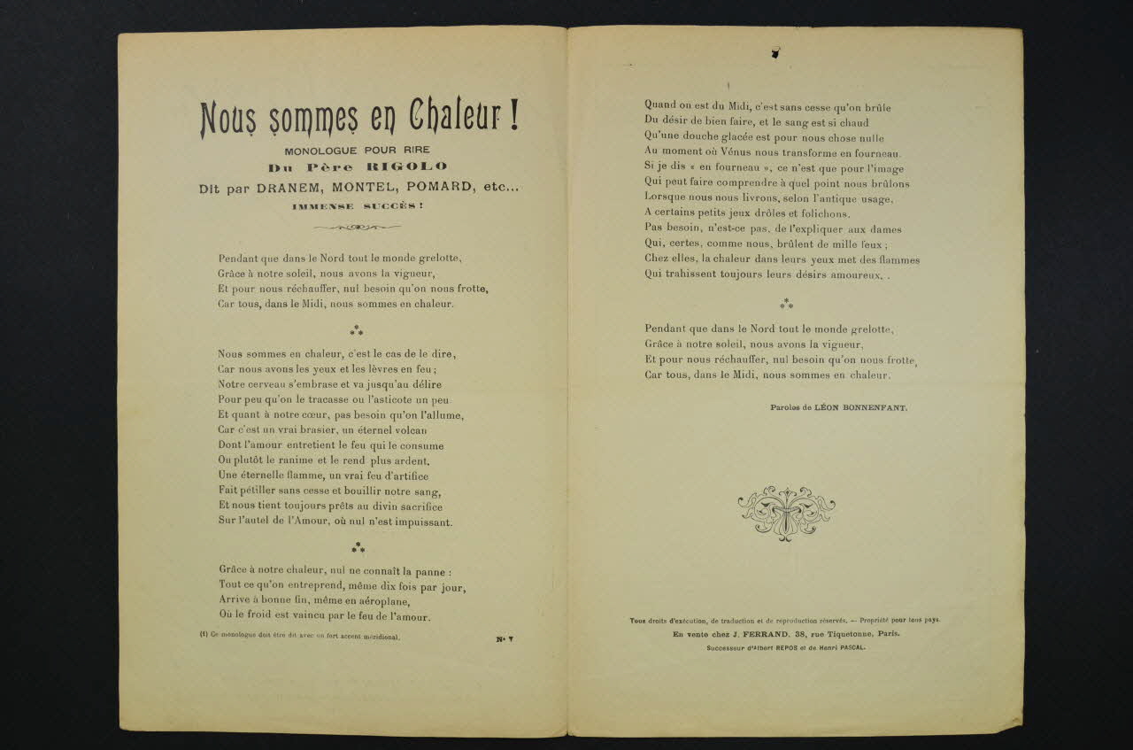 Les inscriptions renseignent le titre de la chanson, le nom des auteurs, de l'artiste et de l'éditeur. A l'intérieur, partition et paroles de la chanson. Au dos, liste d?autres partitions publiées par l?éditeur.Décor