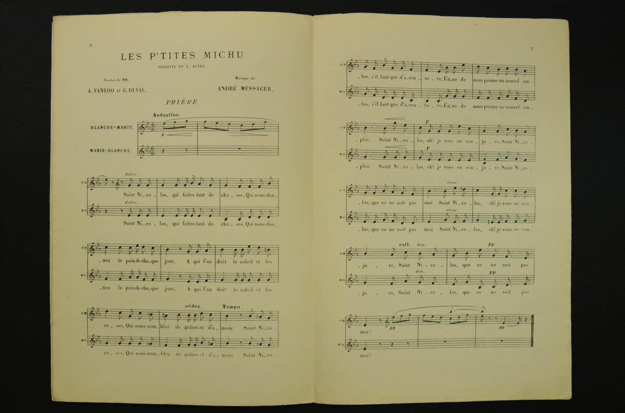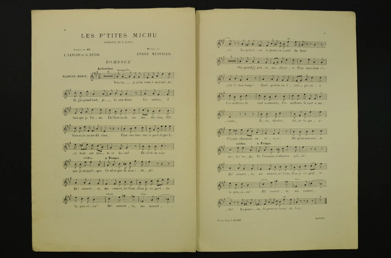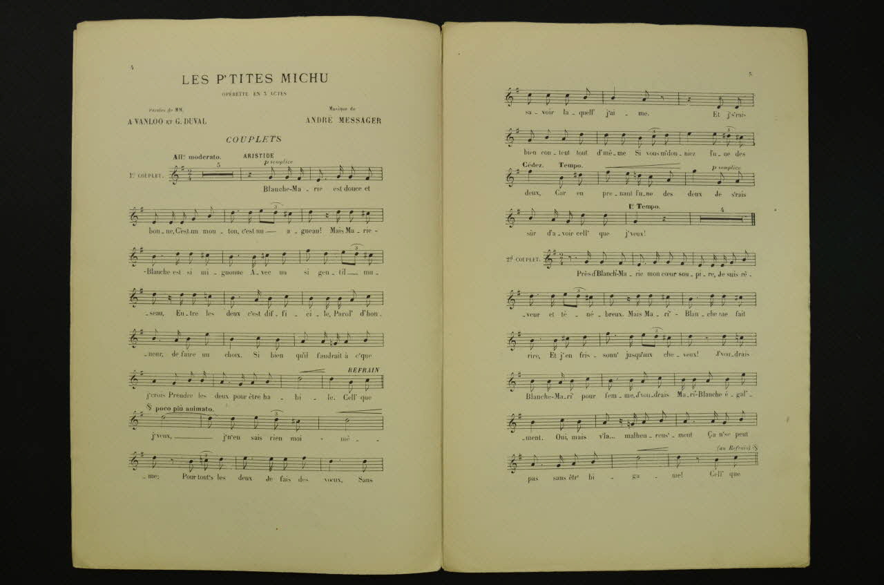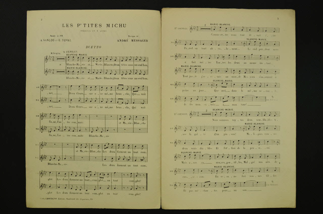 A l'intérieur, paroles et partition. Au dos, listes des cahiers des théâtres. L'intérieur se détache.Décor