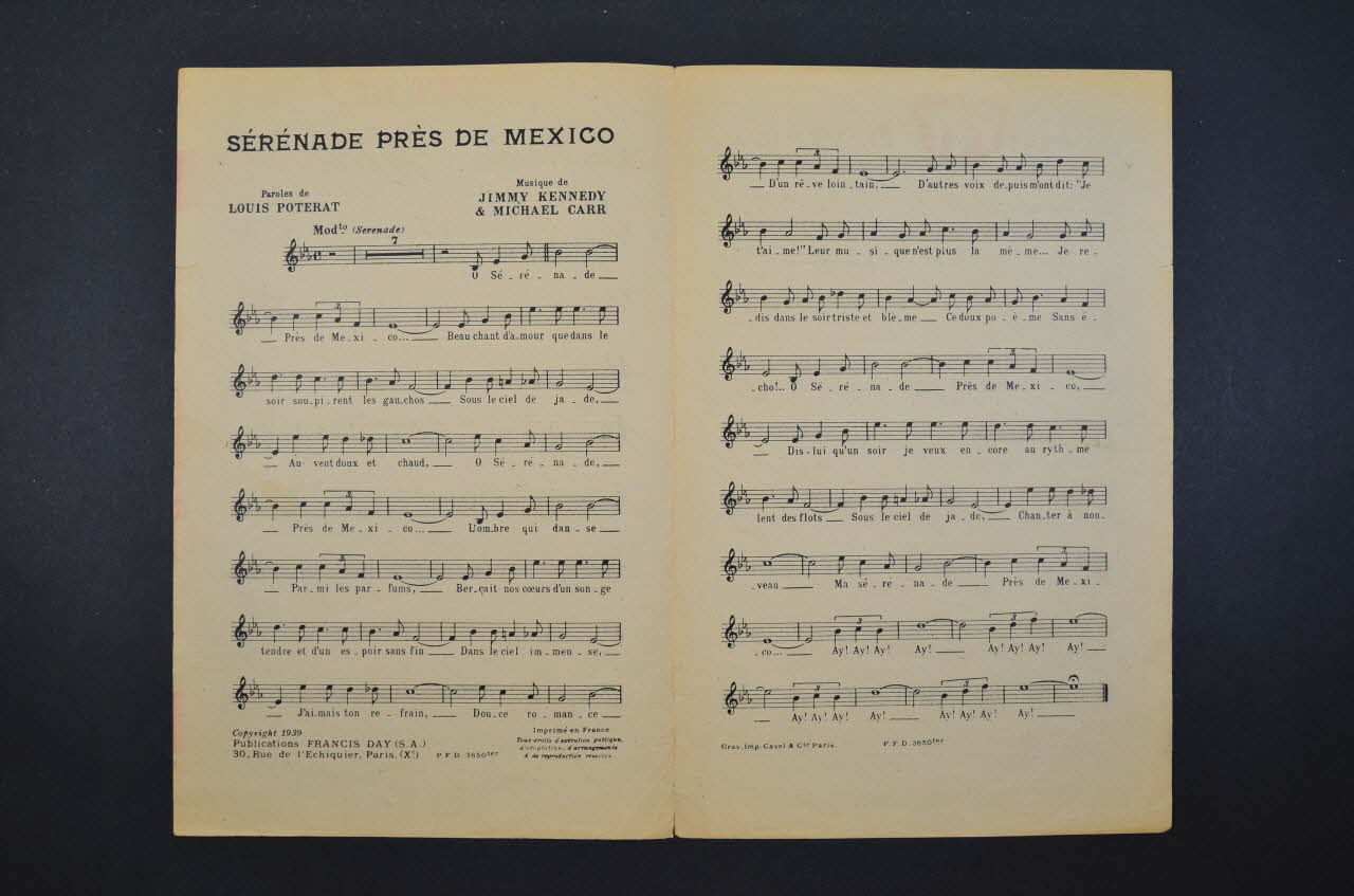Sur la couverture, le portrait photographique de Tino Rossi, Rina Ketty, Yolanda, Jaime Plana, le chanteur sans nom et Georges Marow. Les inscriptions renseignent le titre de la chanson, le nom des auteurs, des artistes et de l'éditeur. A l'intérieur, partition et paroles de la chanson. Au dos, liste d'autres partitions publiées par l'éditeur.Décor