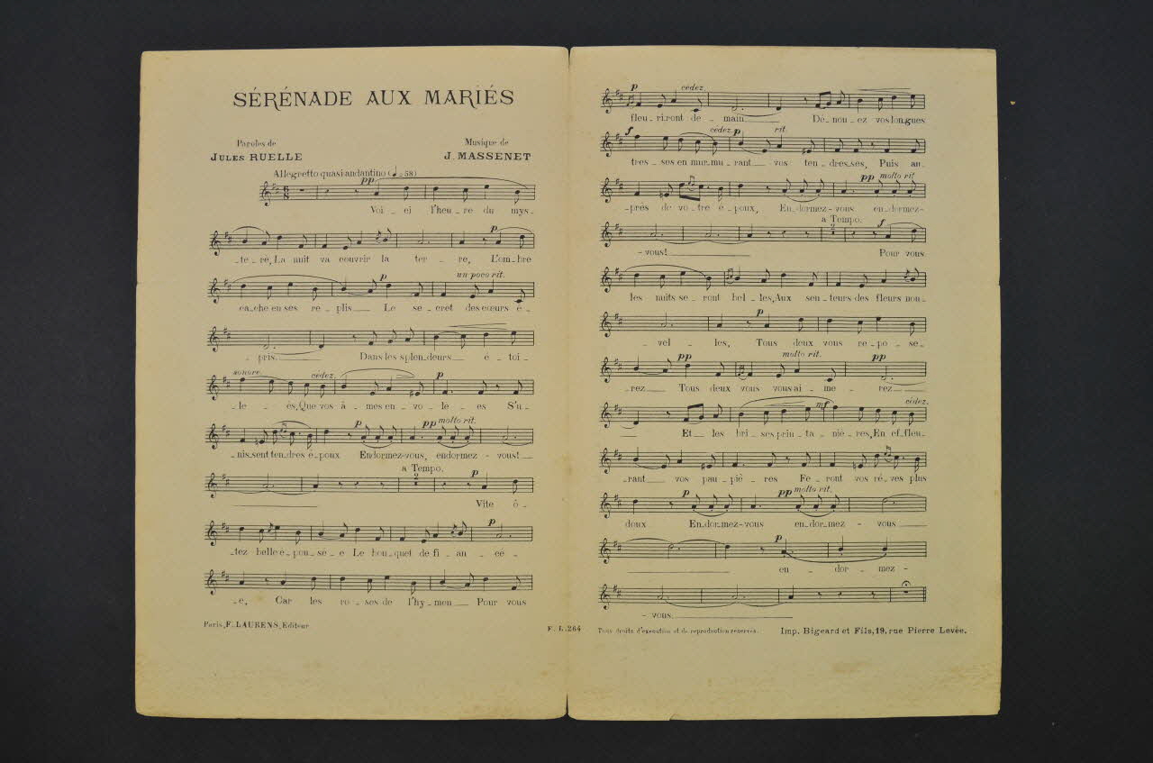 Les inscriptions renseignent le titre de la chanson, le nom des auteurs, de l'artiste et de l'éditeur. A l'intérieur et au dos, les partitions et les paroles des chansons.Décor