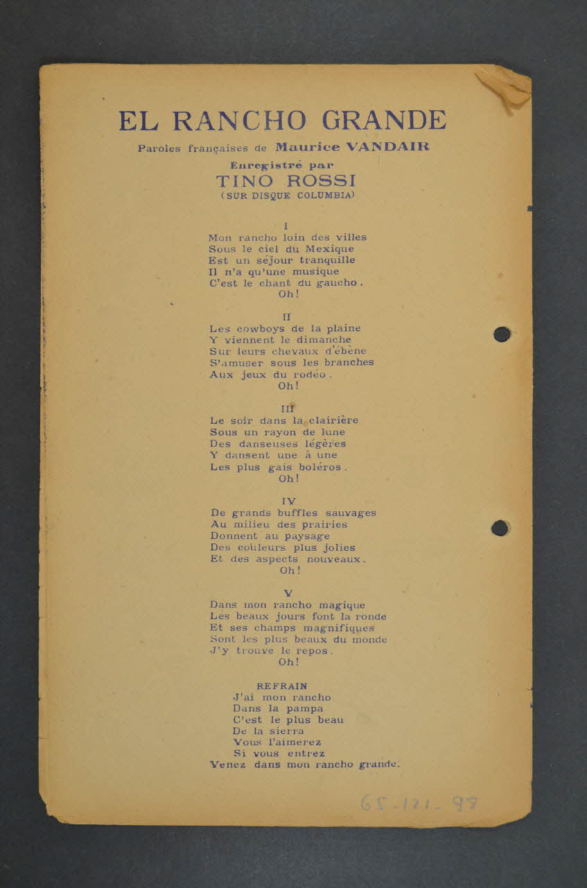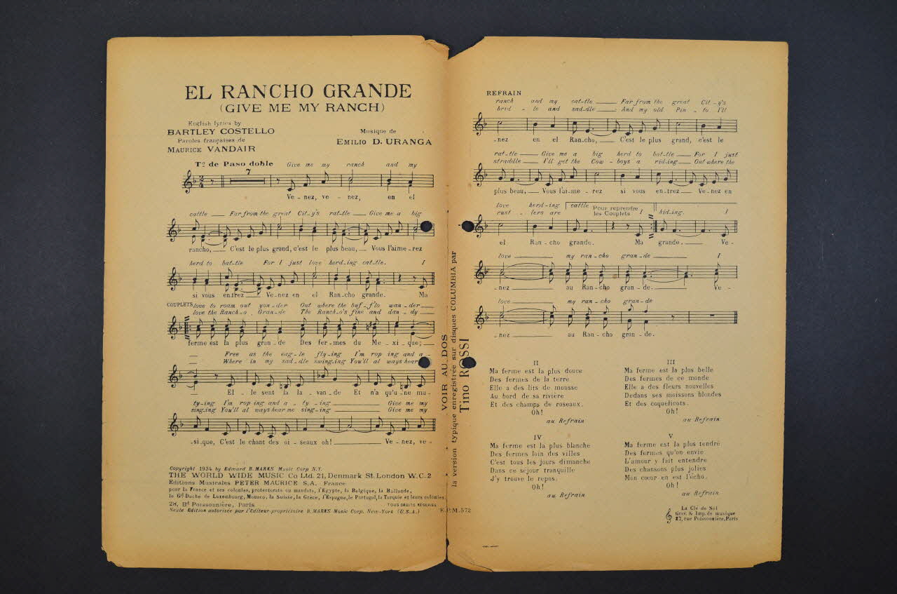 Sur la couverture, les portraits photographiques de Bing Crosby et Tino Rossi, de part et d'autre d'une frise verticale de trois figures de mexicain avec sombrero sur un cheval. Les inscriptions renseignent le titre de la chanson, le nom des auteurs, des artistes et de l'éditeur. A l'intérieur et au dos, partition et paroles de la chanson.Matériaux et techniques