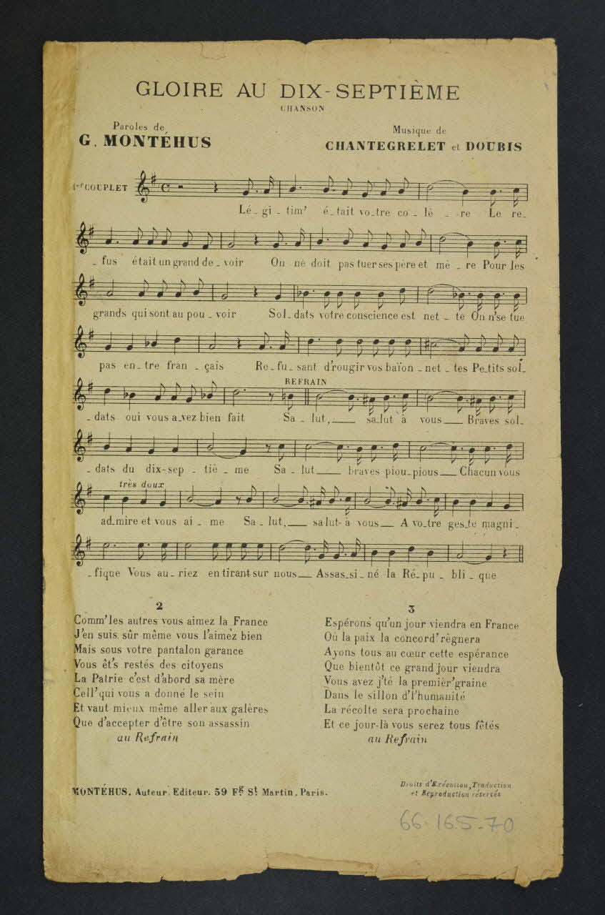 Chanson composée en souvenir de la mutinerie des soldats du 17e régiment d'infanterie de Narbonne qui avaient refusé de tirer sur les manifestants lors de la révolte des vignerons du Languedoc en 1907.
