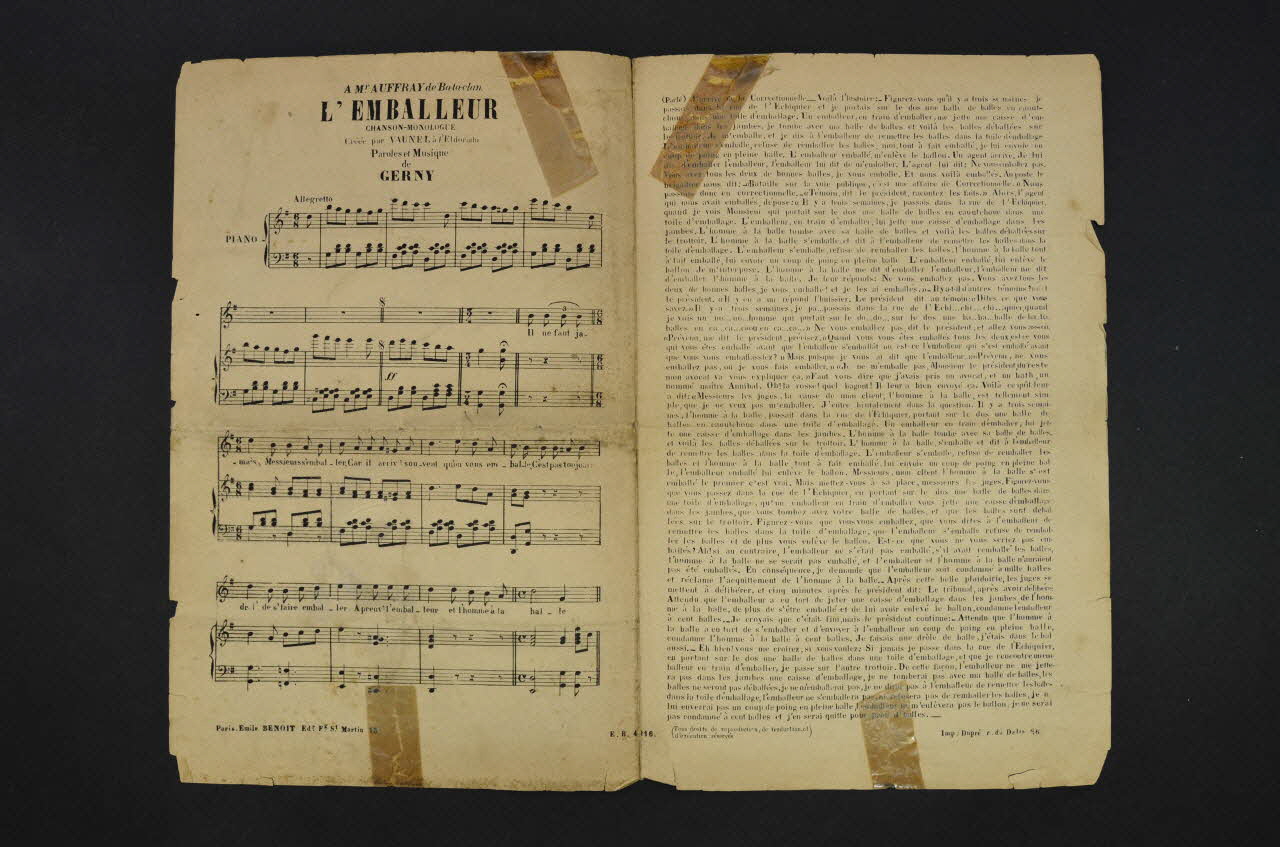 Les inscriptions renseignent le titre de la chanson, le nom des auteurs, de l'artiste et de l'éditeur. A l'intérieur, la partition et les paroles. Au dos, une liste de titres disponibles chez le même éditeur.Décor