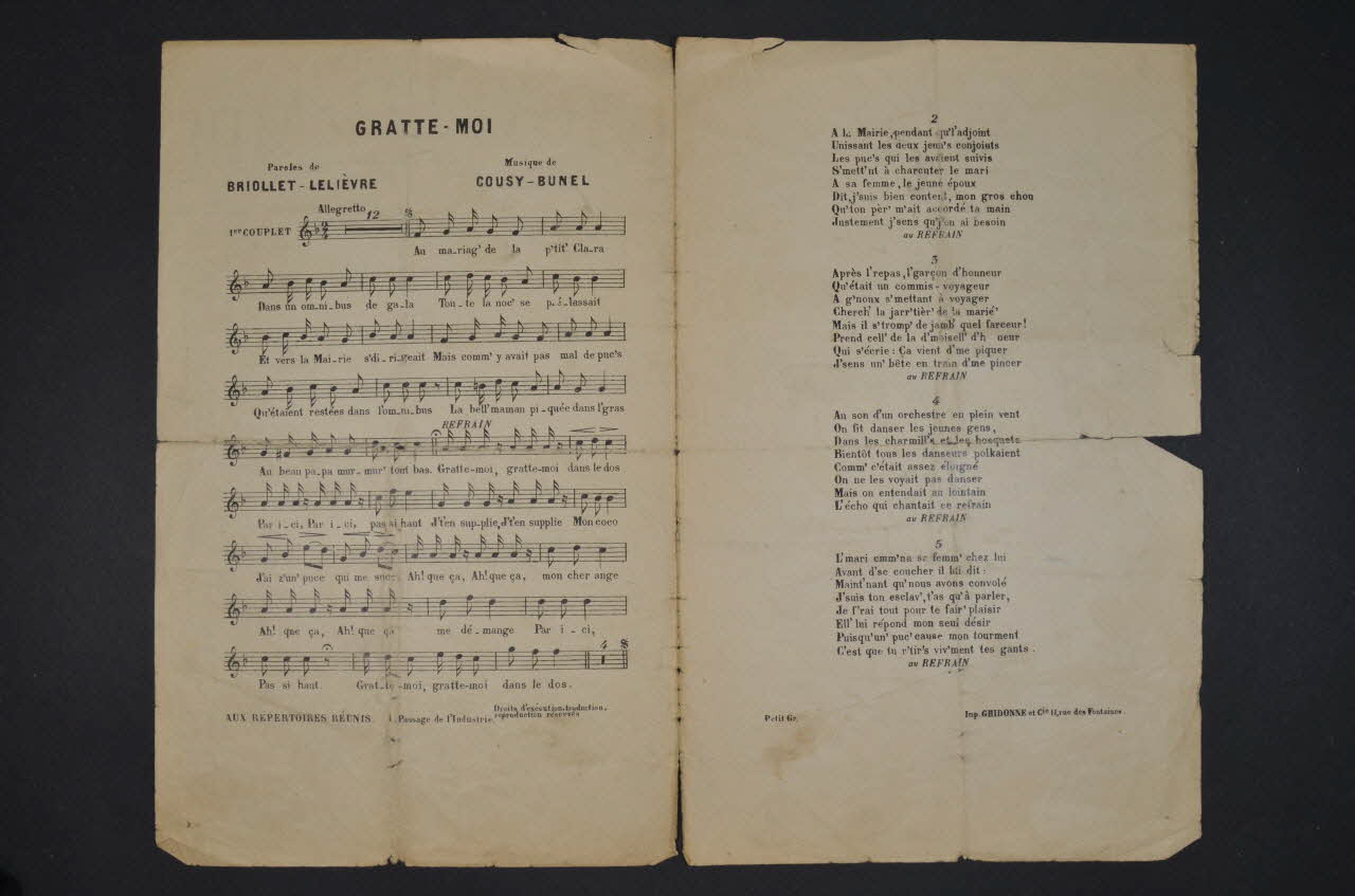 Les inscriptions renseignent le titre de la chanson, le nom des auteurs, de l'artiste et de l'éditeur. A l'intérieur, partitions et paroles de la chanson. Au dos, liste d?autres partitions publiées par l?éditeur.Décor