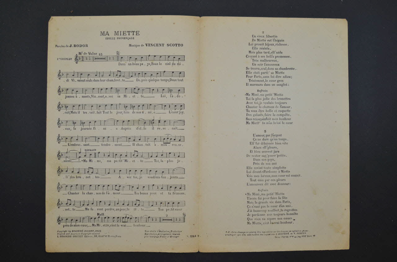 Au dos, portrait photographique en médaillon de Vincent Scotto encadré de motifs floraux et liste d'autres partitions de son répertoire publiées par l'éditeur.