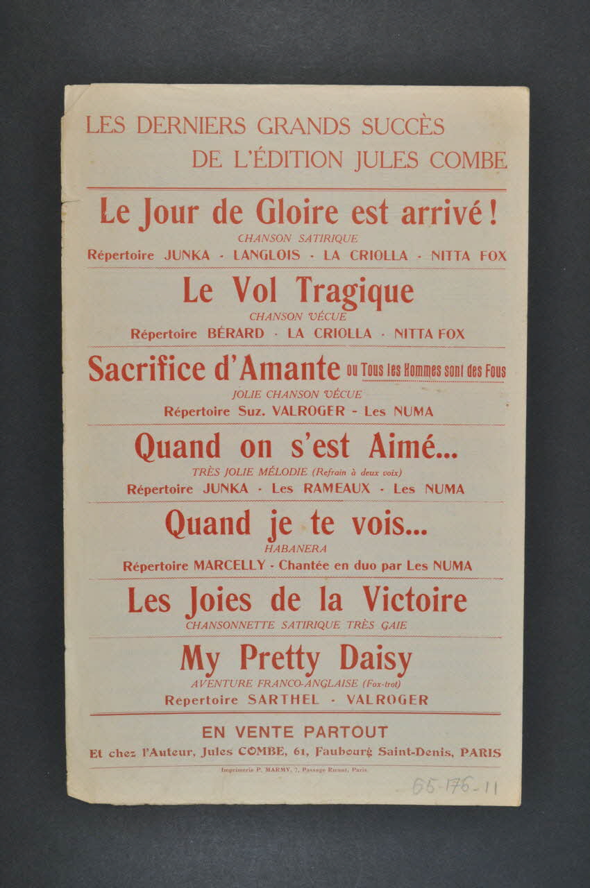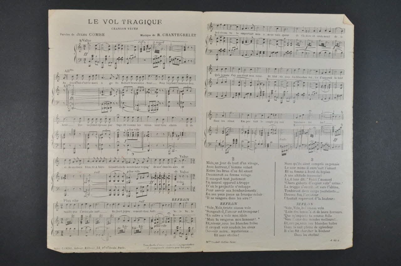 Des inscriptions renseignent le titre, les auteurs, les exécutants et l'éditeur. A l'intérieur, partition et paroles de la chanson. Au dos, liste d'autres partitions publiées par l'éditeur.Décor