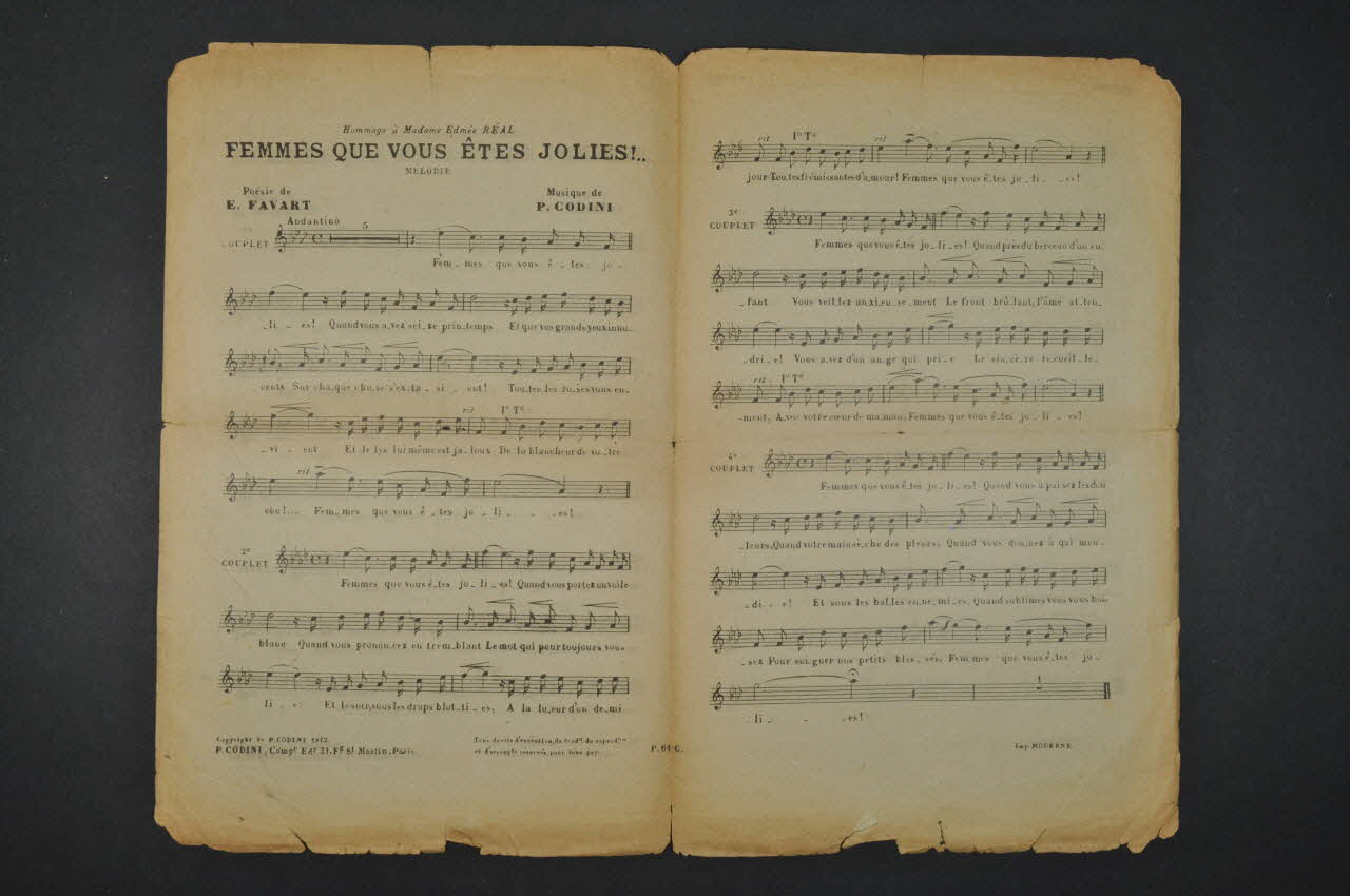 Des inscriptions renseignent le titre, les auteurs, les exécutants et l'éditeur. A l'intérieur, partition et paroles de la chanson. Au dos, liste d'autres partitions publiées par l'éditeur.Matériaux et techniques
