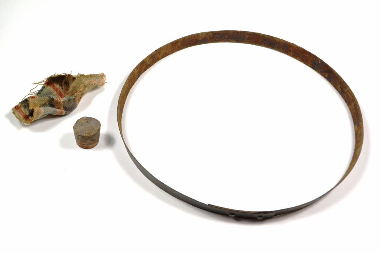 Elle est constituée de vingt-neuf douelles à extrémité biseautée maintenues entre elles par six cerclages (.2-.6) en fer rivetés de diamètres différents. Une douelle présente une ouverture circulaire en son centre, fermée par un bouchon de bois taillé (.7) et rendue hermétique par une pièce de toile (.8) placée entre l'ouverture et le bouchon. Sur une face de la barrique, en partie centrale, sont clouées deux plaques en fer. La première présente une forme rectangulaire et la deuxième une forme circulaire avec un motif décoratif imprimé illisible. Le couvercle est composé de huit planches. La planche centrale présente une perforation circulaire près d'un bord et on note les restes d'une étiquette en papier qui était collée à côté du trou.Matériaux et techniques