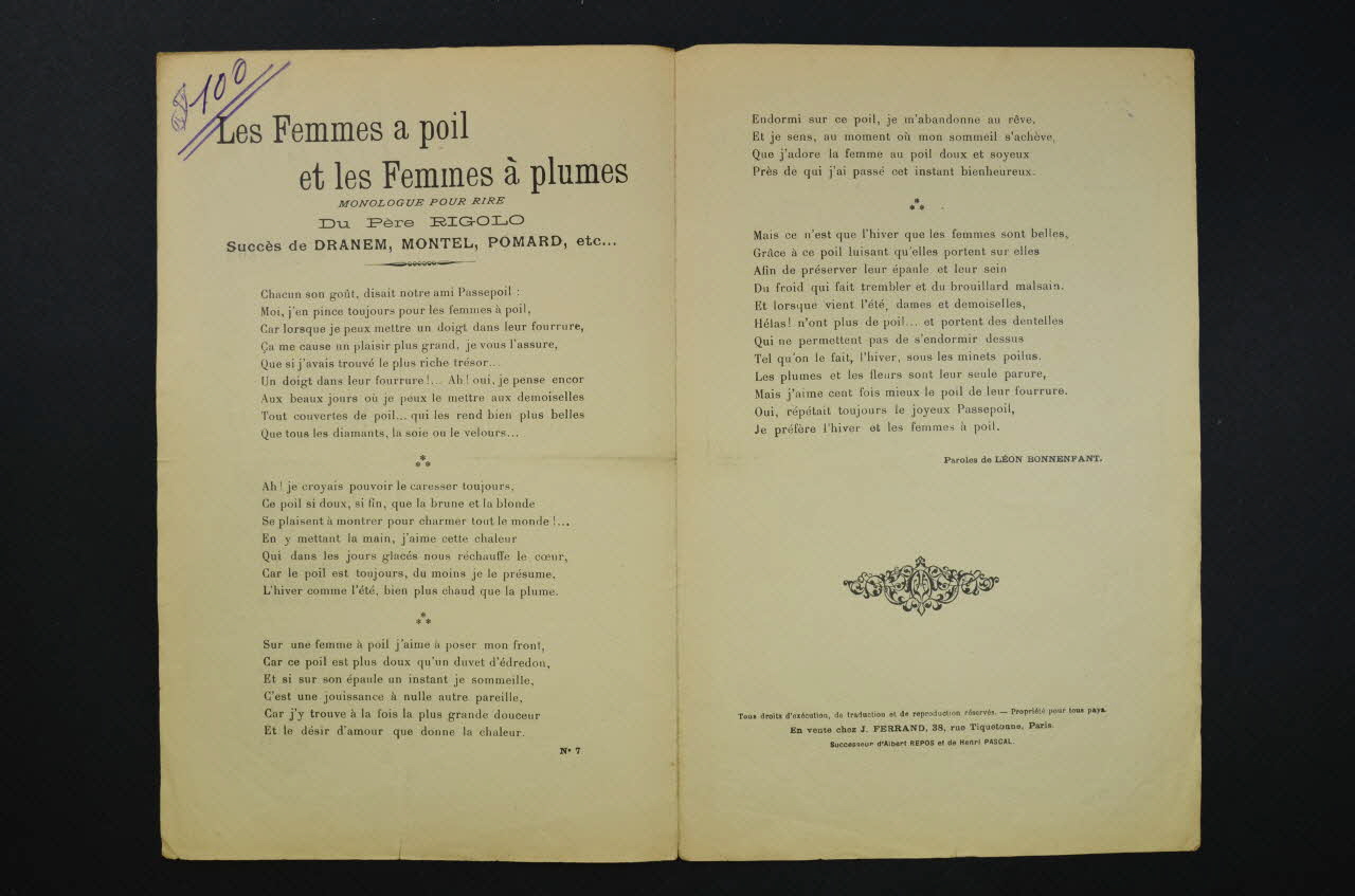 Les inscriptions renseignent le titre de la chanson, le nom des auteurs, de l'artiste et de l'éditeur. A l'intérieur, paroles du texte. Au dos, liste d?autres partitions publiées par l?éditeur.Décor