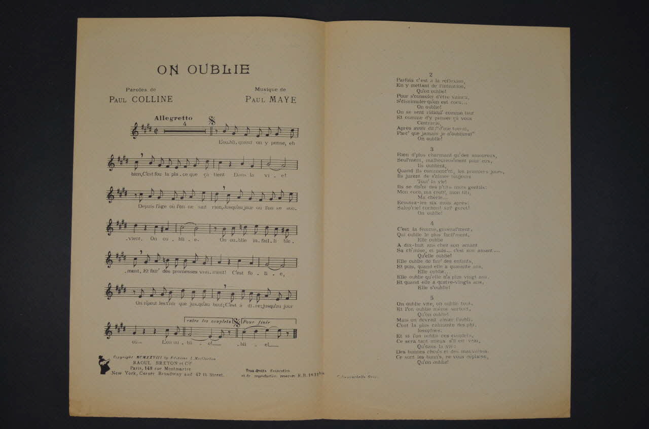 Sur la couverture, le portrait photographique de Paul Gesky avec encadrement de frise de grecques et de palmettes. Les inscriptions renseignent le titre de la chanson, le nom des auteurs, de l'artiste et de l'éditeur. A l'intérieur, partition et paroles de la chanson. Au dos, liste d'autres partitions publiées par l'éditeur.Décor