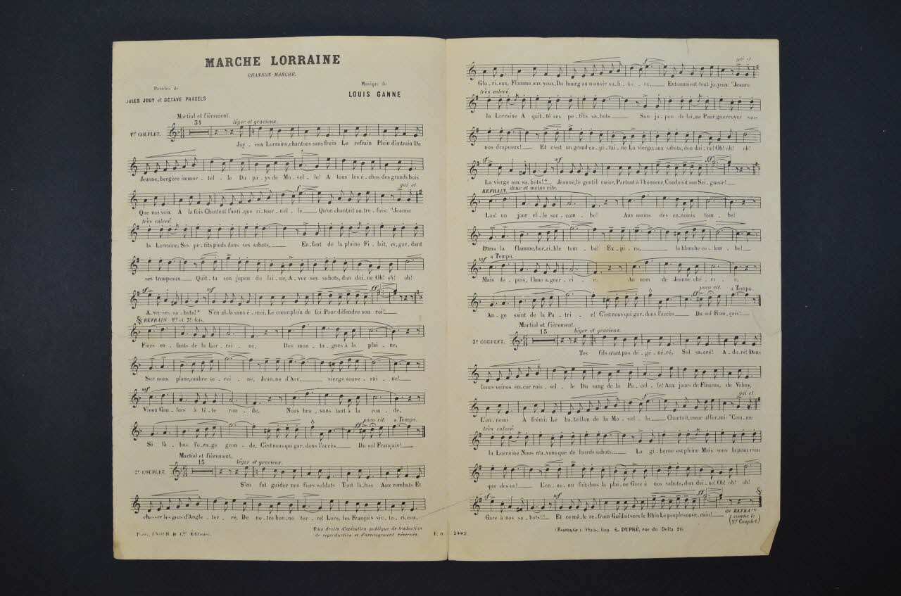 Feuillet rectangulaire en papier industriel imprimé. Le feuillet contient la partition et les paroles de la chanson. Au dos, publicité pour l'éditeur.Décor