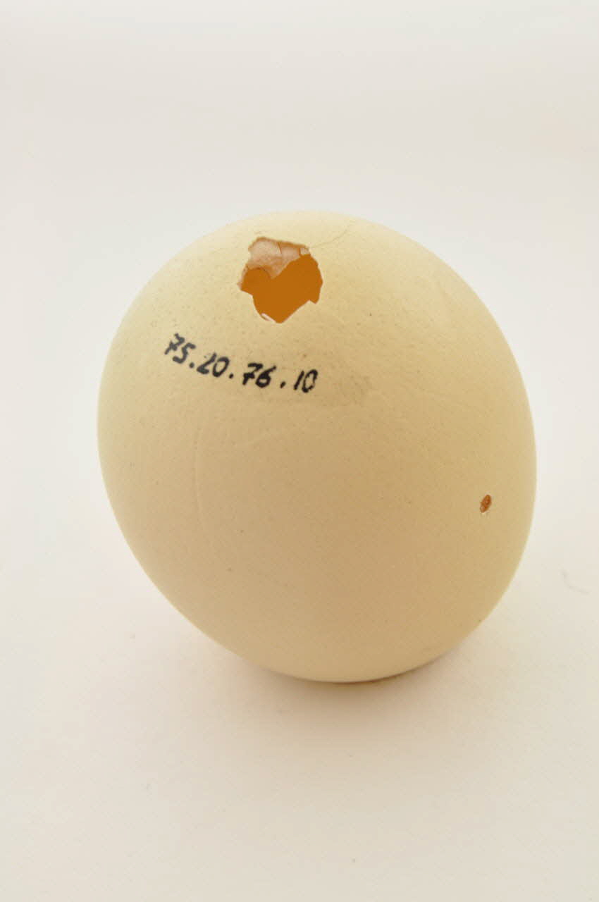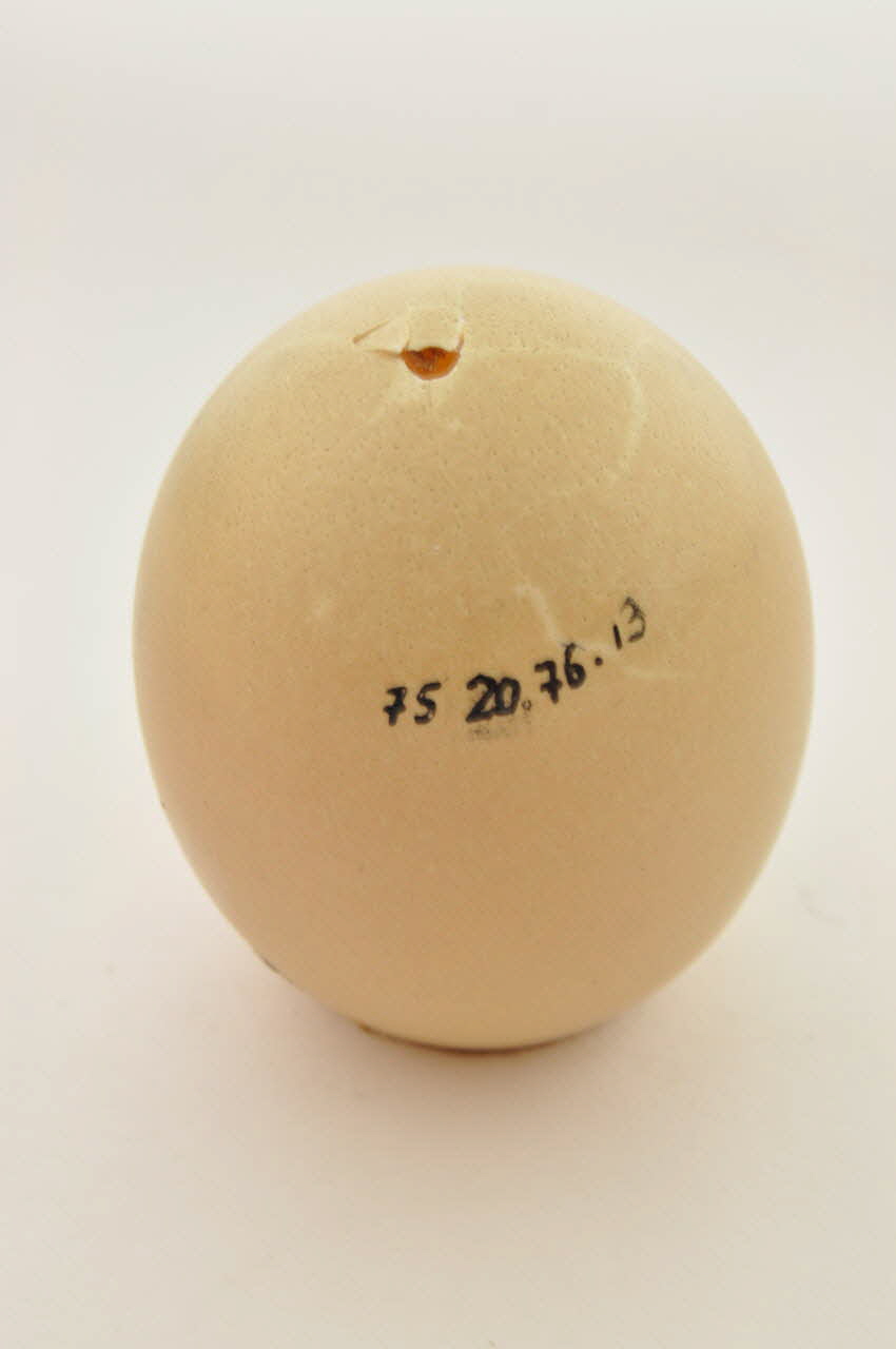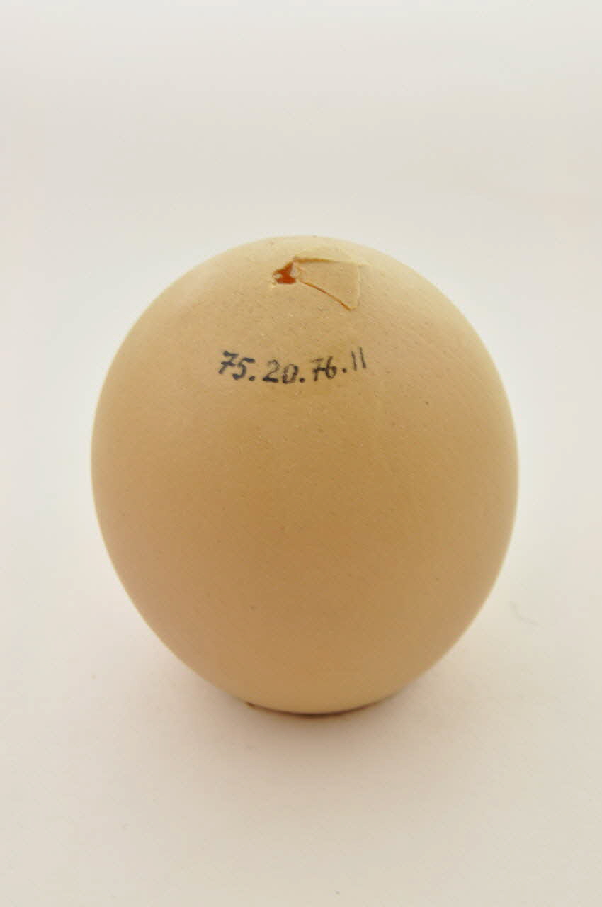 Une douzaine d'oeufs vidés, dans un contenant en carton spécialement conçu pour conserver les oeufs.Matériaux et techniques
