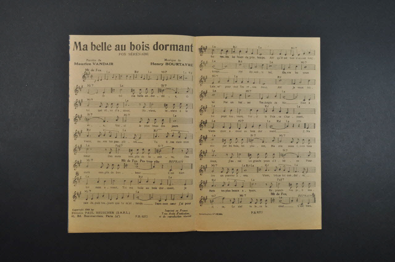 Sur la couverture, les portraits photographiques de Hirigoyen, Jean Patrat et Adrien Adrius ; à l'arrière-plan, livre ouvert avec illustration (jeune femme allongée dans les bois). Les inscriptions renseignent le titre de la chanson, le nom des auteurs, des artistes et de l'éditeur.