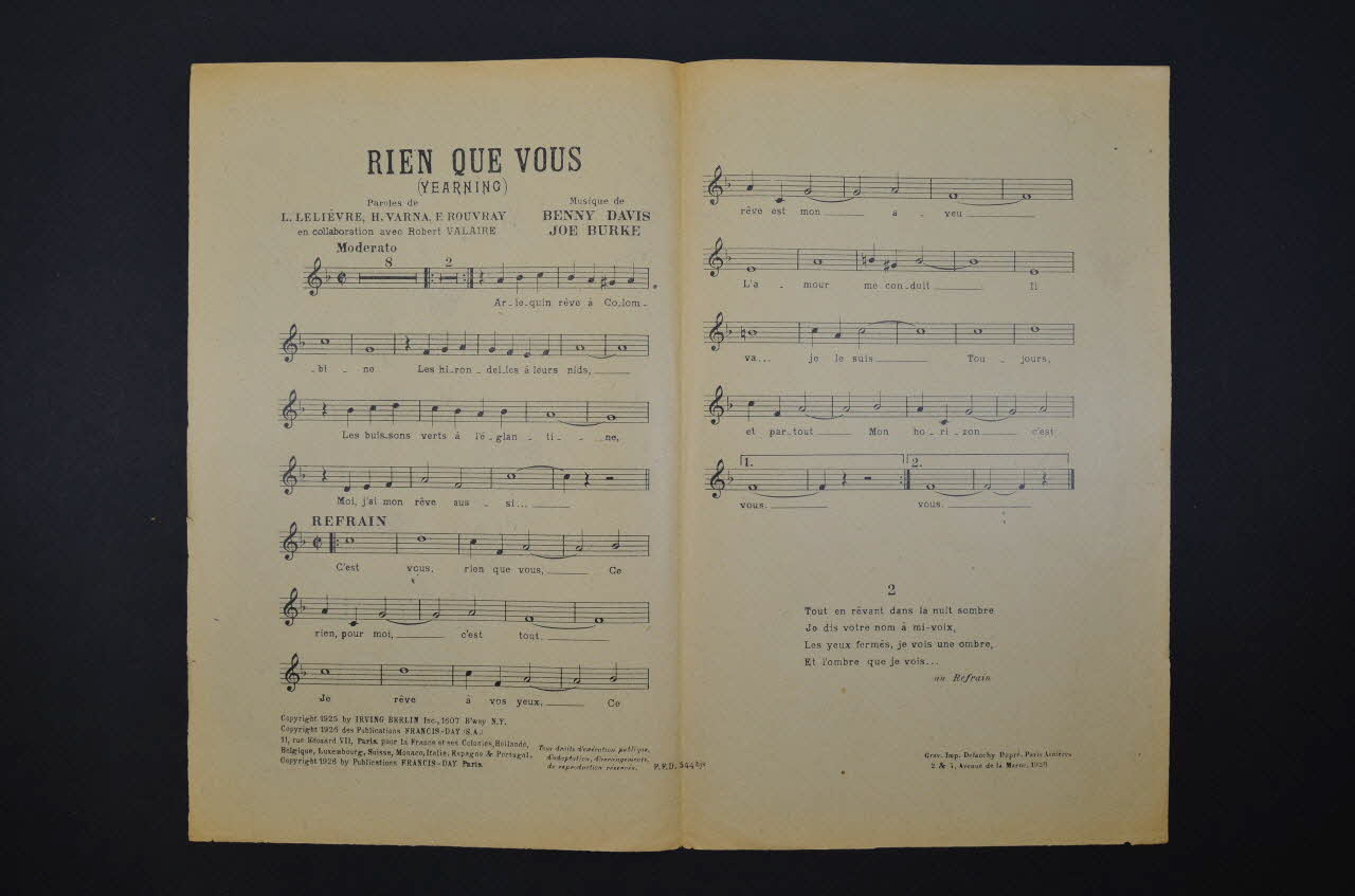 Sur la couverture, la représentation stylisée d'un couple s'embrassant, dans un encadrement circulaire ; dans l'angle inférieur droit, le portrait photographique en médaillon de Lynel. Les inscriptions renseignent le titre de la chanson, le nom des auteurs, des artistes et de l'éditeur. A l'intérieur, partition et paroles de la chanson. Au dos, liste d'autres partitions publiées par l'éditeur.Décor