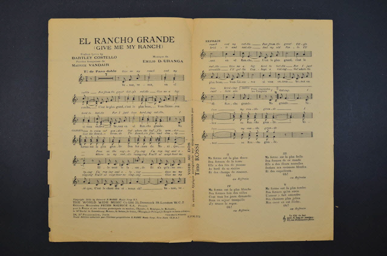 Sur la couverture, les portraits photographiques de Bing Crosby et Tino Rossi, de part et d'autre d'une frise verticale de trois figures de mexicain avec sombrero sur un cheval. Les inscriptions renseignent le titre de la chanson, le nom des auteurs, des artistes et de l'éditeur. A l'intérieur et au dos, partition et paroles de la chanson.Décor